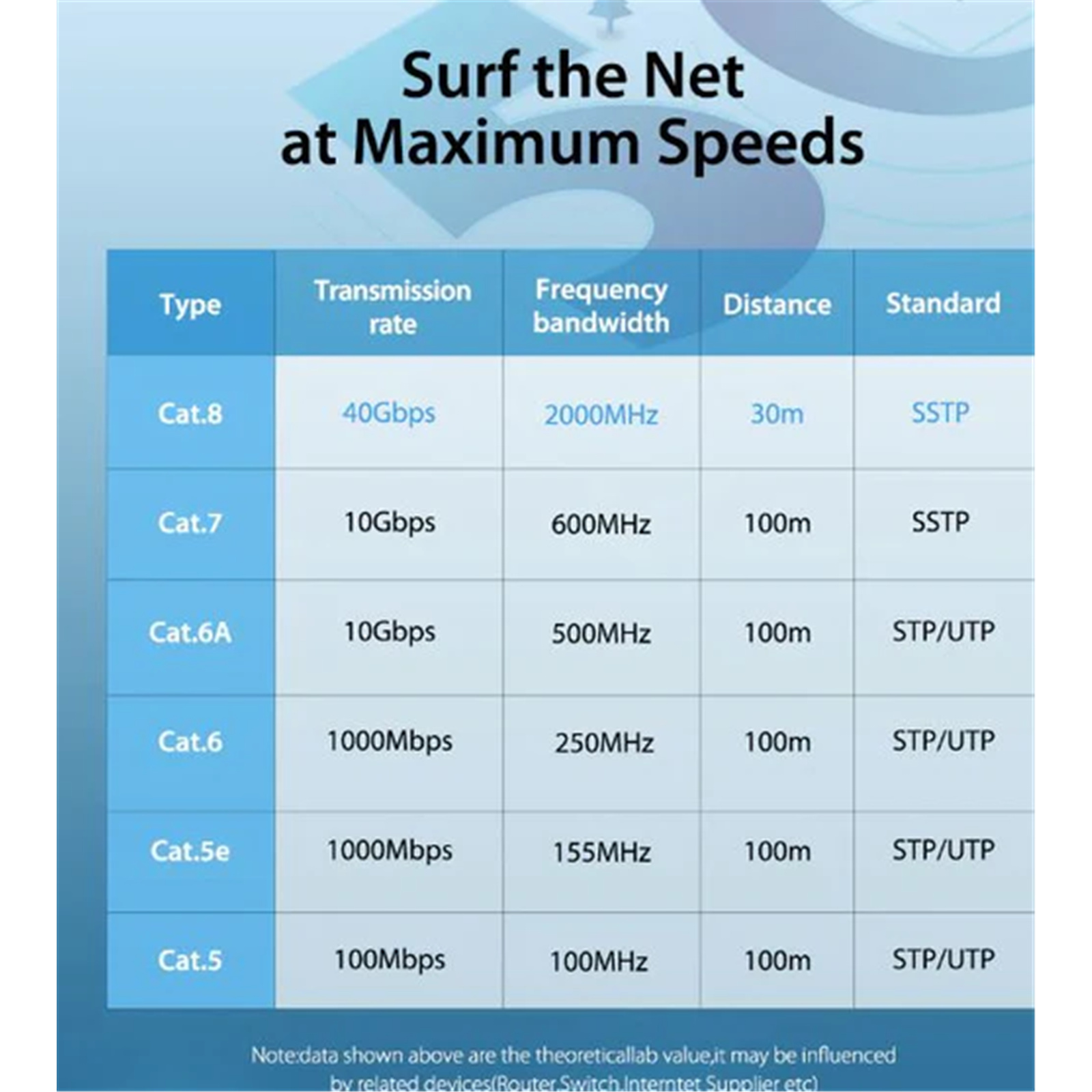 CAT 8 Ethernet cable support bandwidth up to 2000MHz and transmitting speed up to 40Gbps. This Ethernet cable meets the requirements for efficiency.