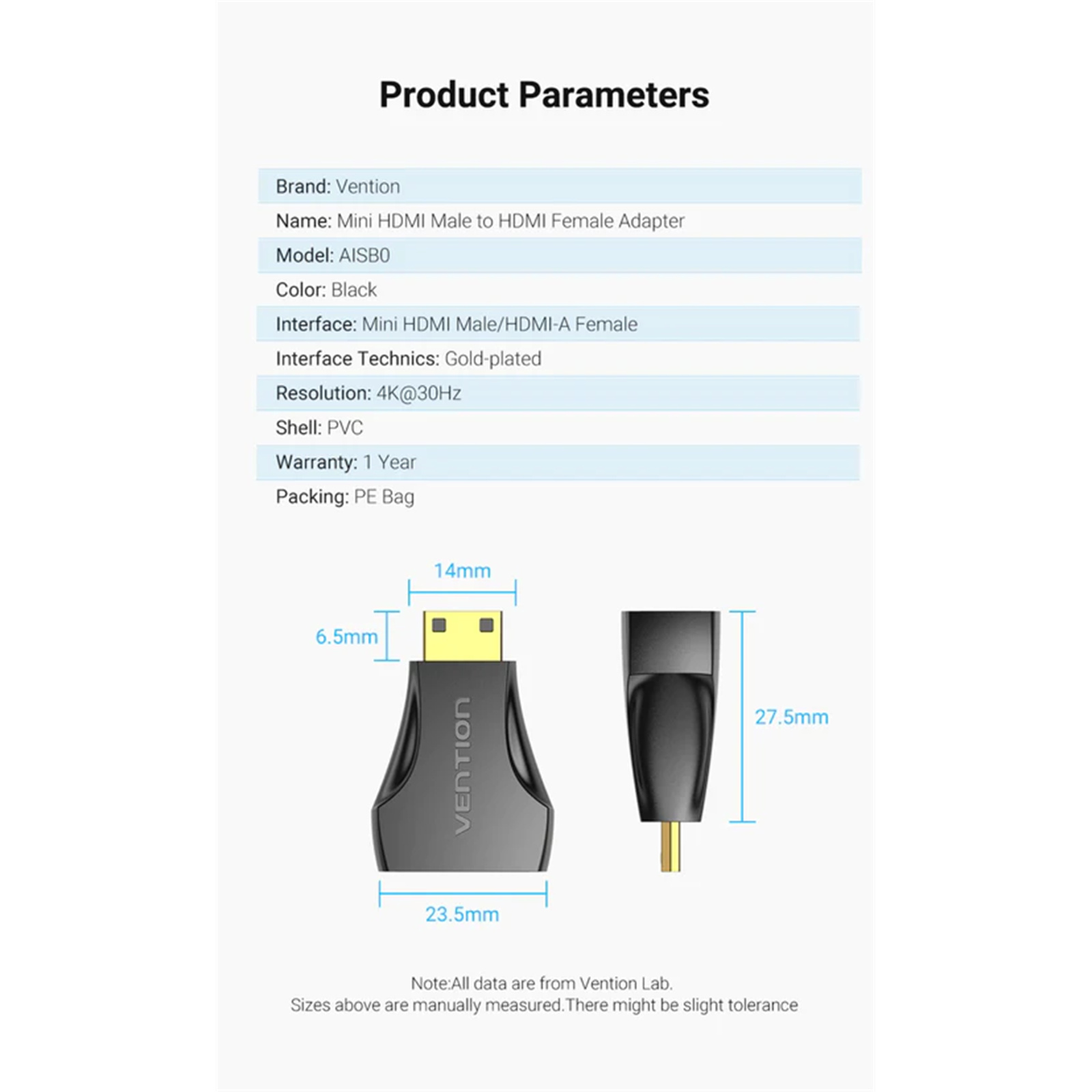 Product URL: https://www.pbtech.co.nz/product/VNT1280/Vention-AISB0-Mini-HDMI-Male-to-HDMI-Female-Adapte