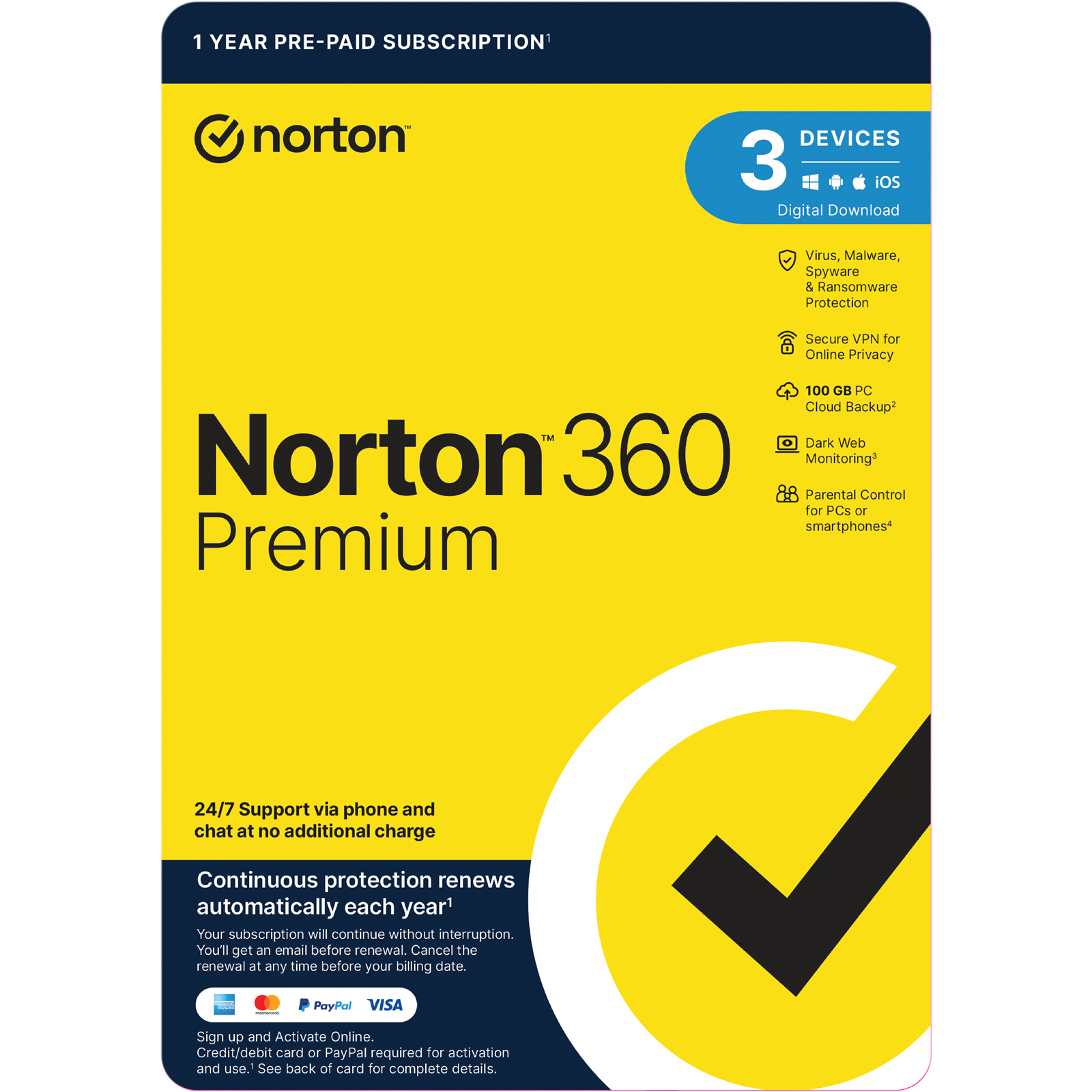 Norton 360 Premium 3 Devices - 12 Months 1 User - 3 Devices - 100GB PC Cloud Backup - Scam Protection - Dark Web Monitoring - Includes Secure VPN Generic ENR RSP DVDSLV GUM