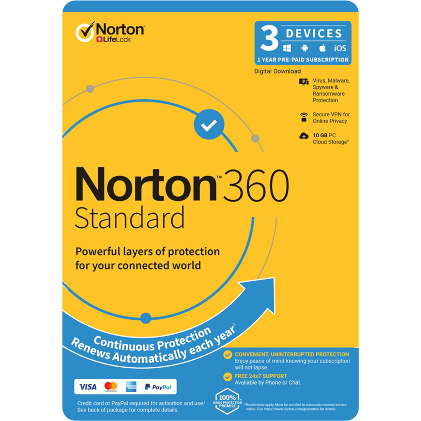 Norton 360 Standard provides comprehensive malware protection for up to 3 PCs, Macs, Android or iOS devices, plus Cloud Backup, for PC to help prevent data loss due to ransomware or hard drive failures and a Password Manager to store and manage your passwords.