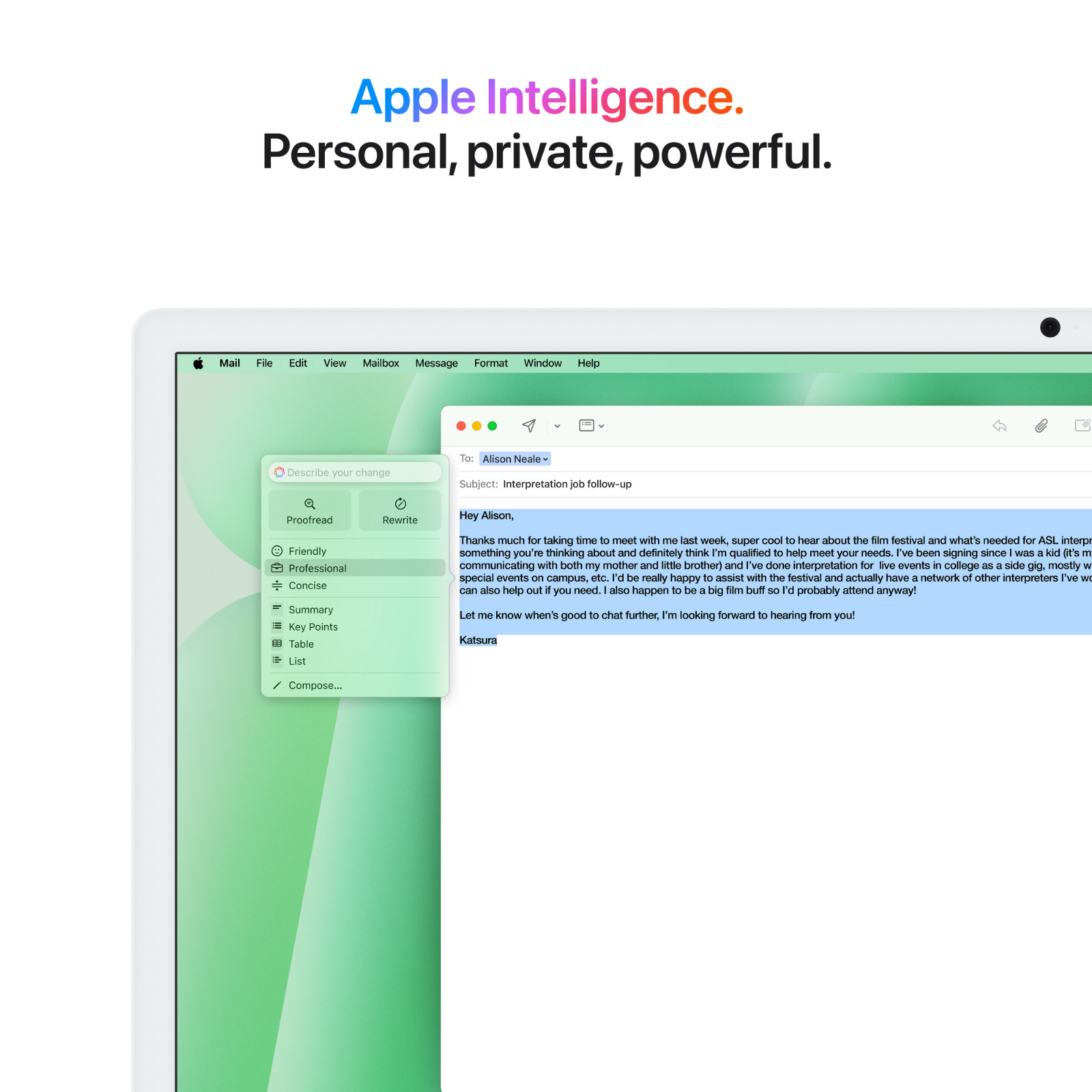 Apple Intelligence is designed to protect your privacy at every step. It's integrated into the core of your Mac through on-device processing. So it's aware of your personal information without collecting your personal information.