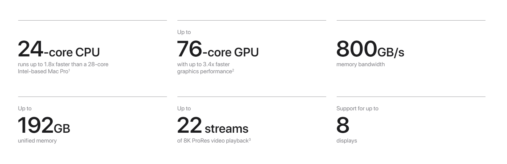 24-Core CPU - 60-Core GPU - 32-Core Neural Engine Memory - 64GB Unified Memory - 1TB of SSD Storage - Stainless Steel Frame with Feet