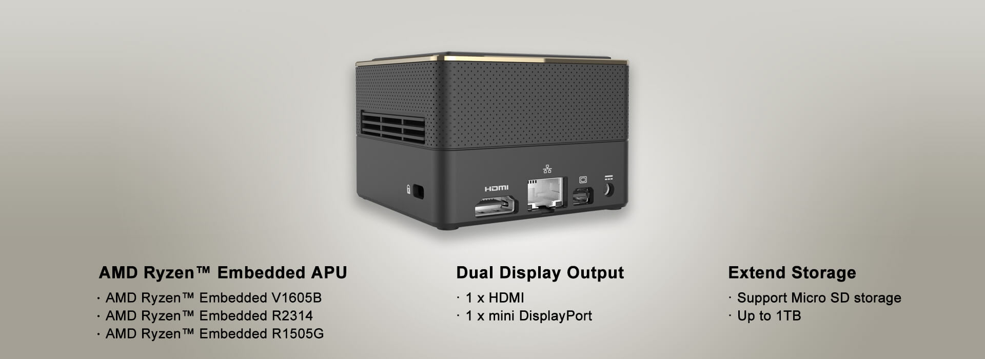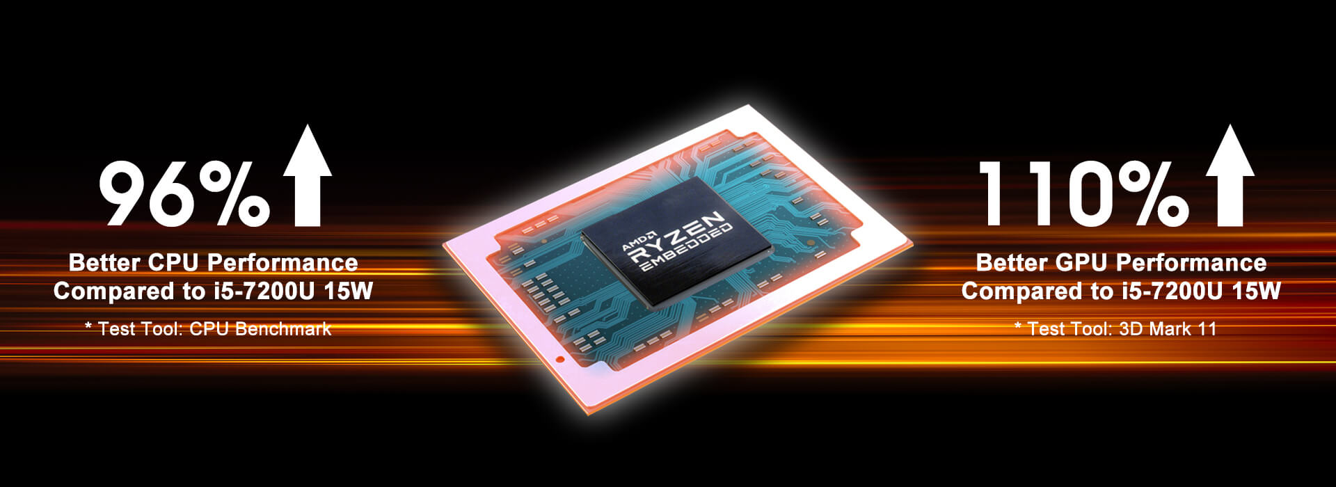 Smaller than a mouse, LIVA Q3 Plus features the AMD Ryzen Embedded V1605B APU. The V1605B is a 4-core/8-thread SoC with 15W thermal design power (TDP) and incredible performance that sets a new standard in processing power for next-generation embedded designs. The internal GPU can offer up to 47% performance improvement compared to competitors' product.
