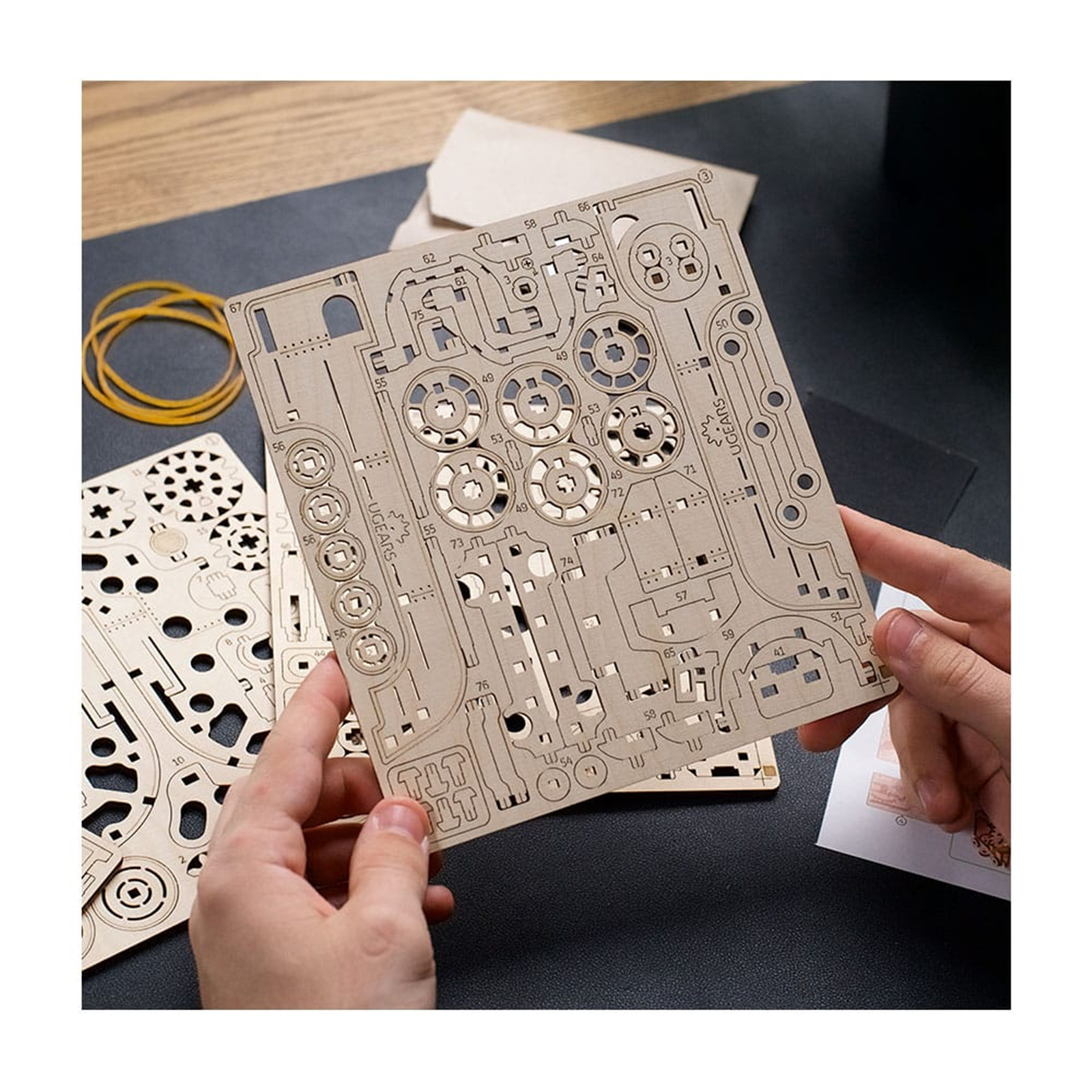 One of the great things about Ugears models is they can be built without glue or special tools. Everything you need for assembly comes right in the box. Just punch the laser pre-cut pieces out of their composite wood boards and snap together. Made from art-quality composite wood, Ugears models can be left in their attractive natural wood state, or colored, stained or painted in a color scheme of your choosing (paints not included). When assembling your Mini Locomotive remember to lightly sand and wax moving parts to make them run smoothly (wax and sandpaper included).
