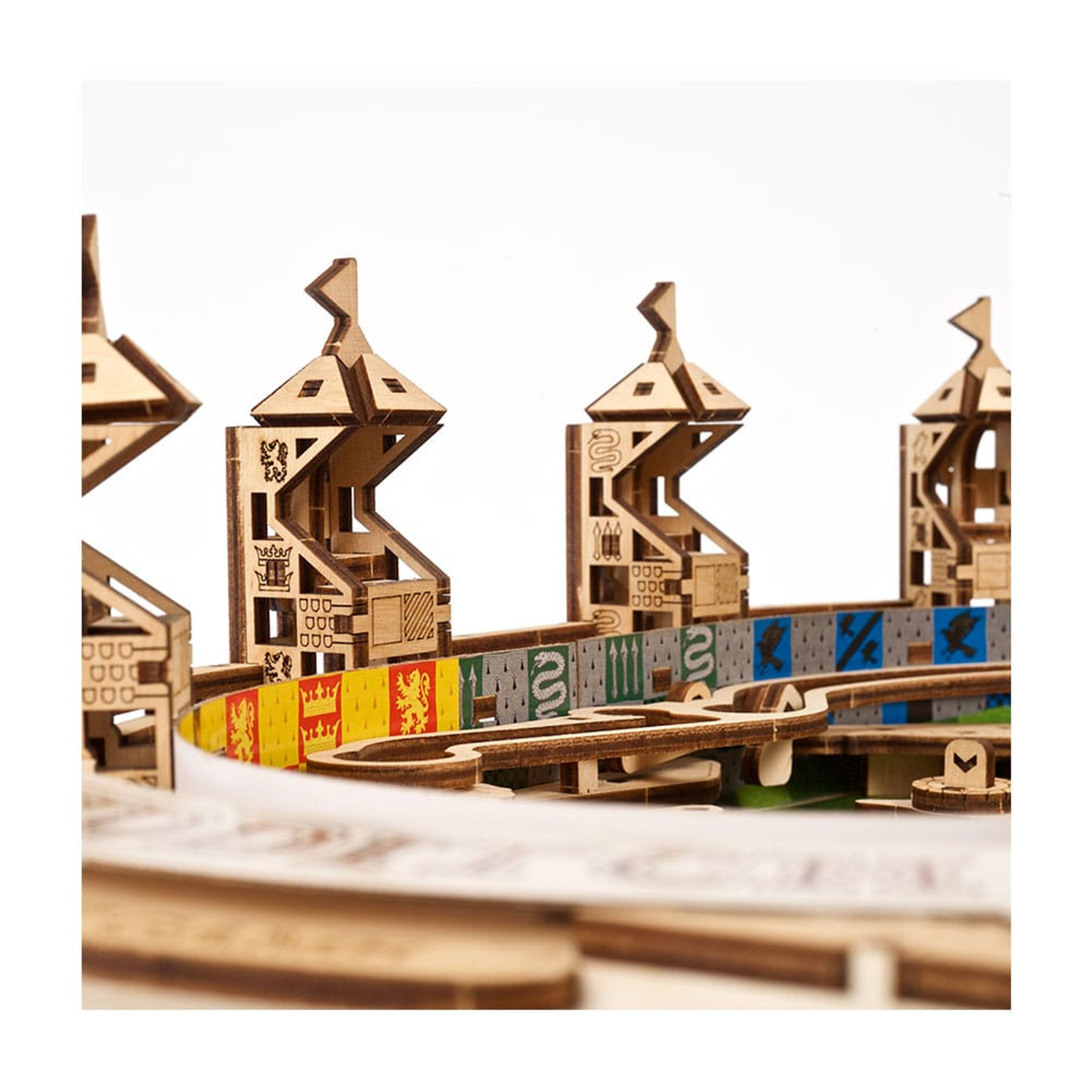 The DIY Ugears Quidditch™ Pinball model is a visually-stunning stadium, comprising a playing field made of cardboard printed with decorative elements, 8 elevated viewing platforms engraved with the logos of the four houses of Hogwarts™, functional scoreboard, a chest for storing the Golden Snitch™ and three Quaffle™ balls, and functional pinball game elements including flippers, bumpers, targets and obstacles.