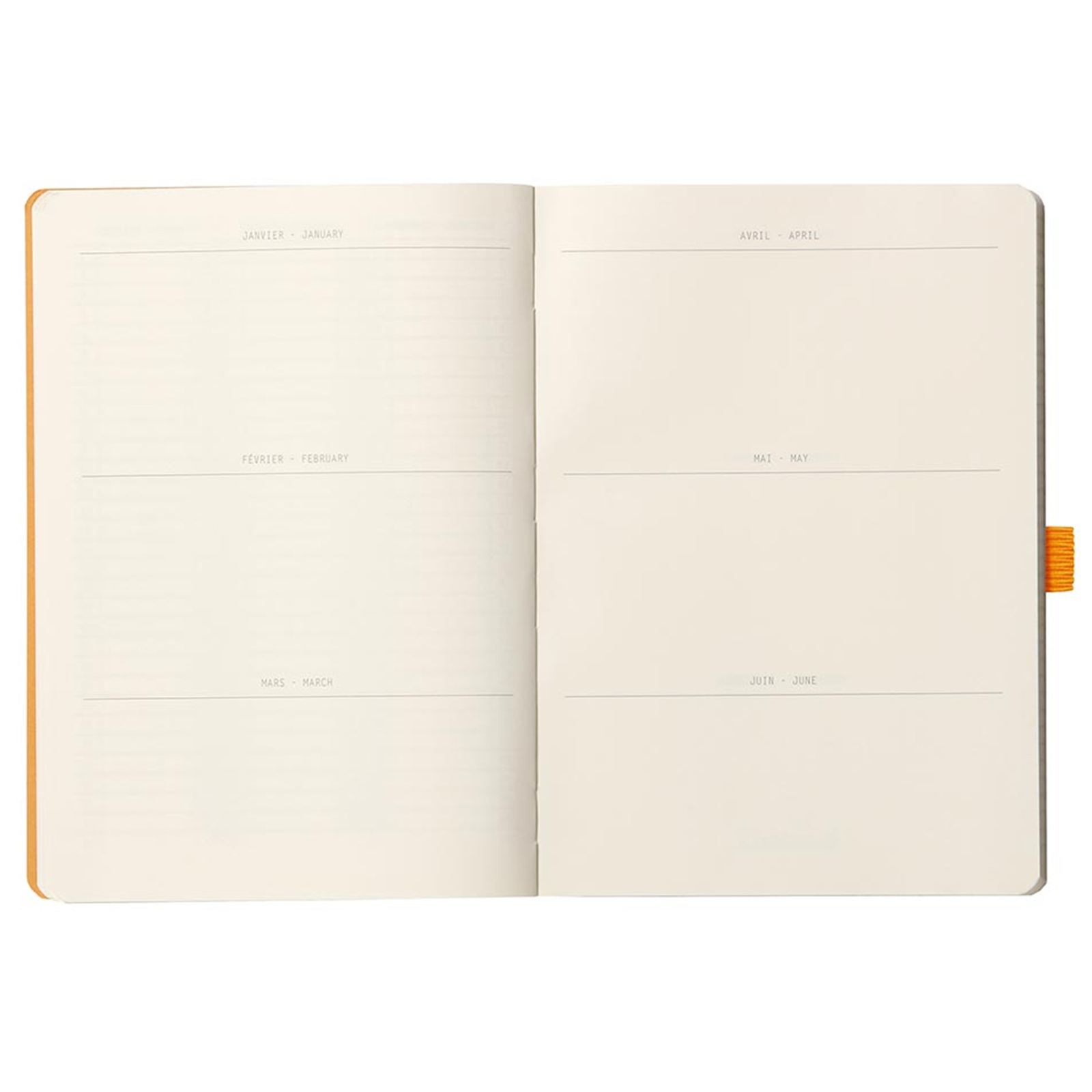 The Goalbook is perfect to organise your days and make sure you don't forget anything. It has numbered note pages, contents tables, indexing and perpetual calendars so you can customise as you please, and design and manage your own organisation system. Jot down your lists using short, abbreviated sentences. Be even more efficient and tag them using customised symbols. As and when required, these lists of note, tasks and events can then be updated, corrected or even put on hold. Rhodiarama Goalbook notebooks feature the Rhodia logo embossed on the cover with a bright orange elastic closure, ribbon bookmark and pocket on the inside back cover, 6 page index and perpetual calendar. The paper is Clairefontaine's 90gsm bleed-proof so you can be assured of using both sides of every sheet. The lovely smooth paper is a pleasure to write on with a fountain pen. PEFC-certified from sustainable forestry. Made in France by Clairefontaine.
