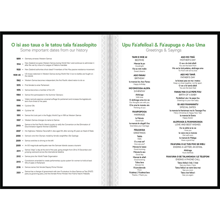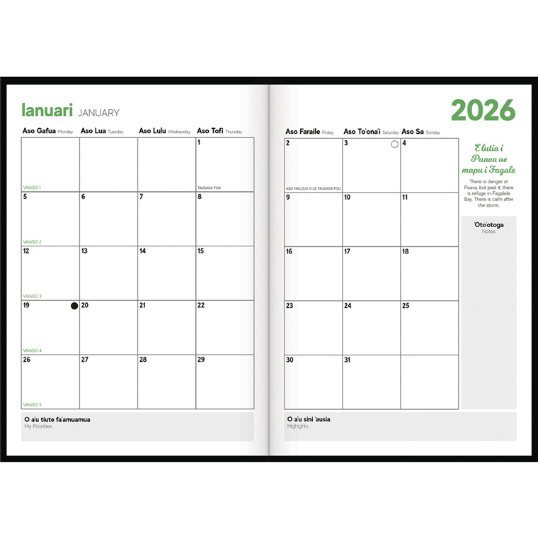 A standout feature of the Tuhi Diary A51 is its commitment to promoting Samoan language and culture. Rich bilingual content in both Samoan and English is thoughtfully woven throughout the diary. Users will discover elements such as Samoan history, significant dates, prayers, songs, greetings, traditional sayings, and proverbs. These inclusions foster cultural pride, language use, and a sense of belonging among Samoan users, while also serving as an educational resource for others.