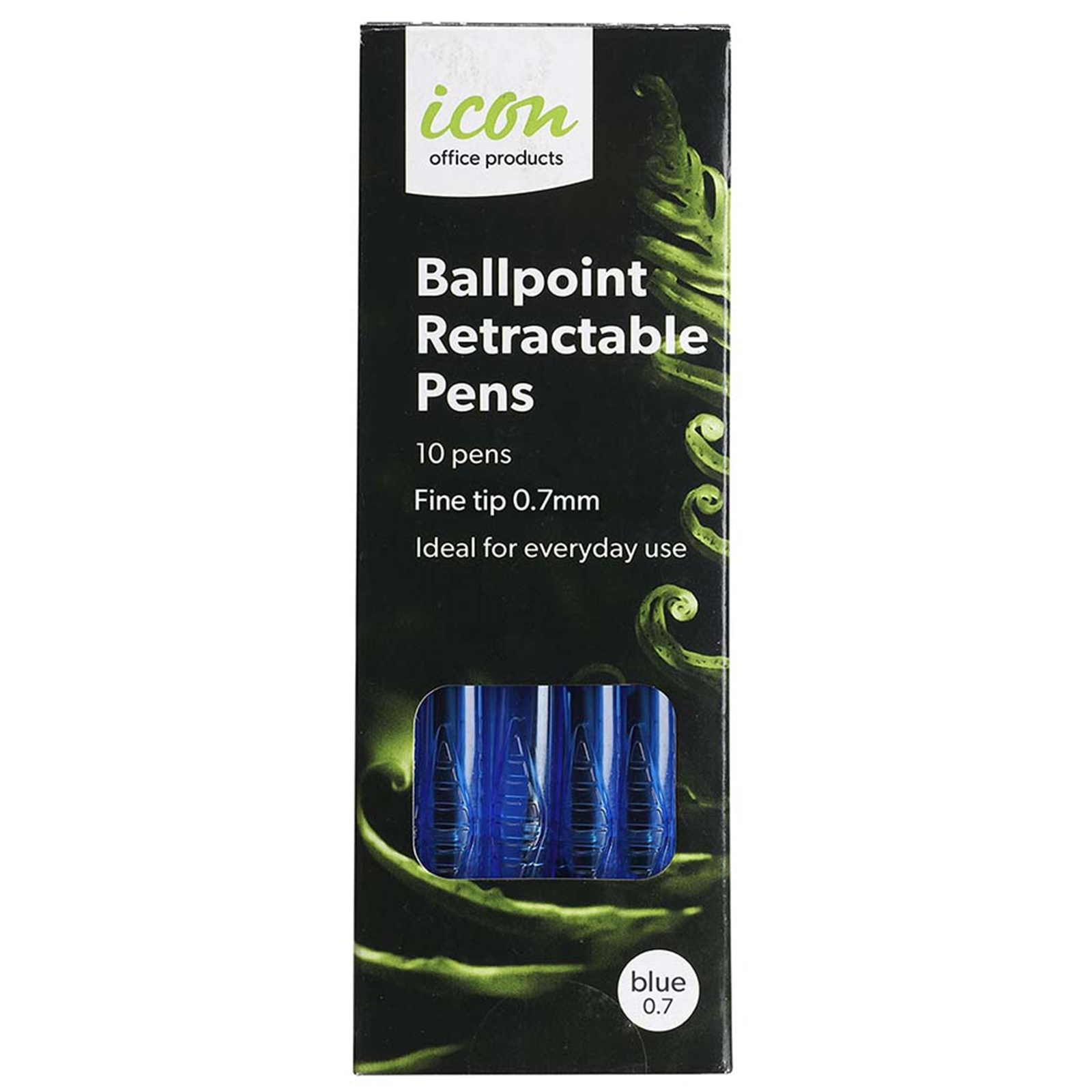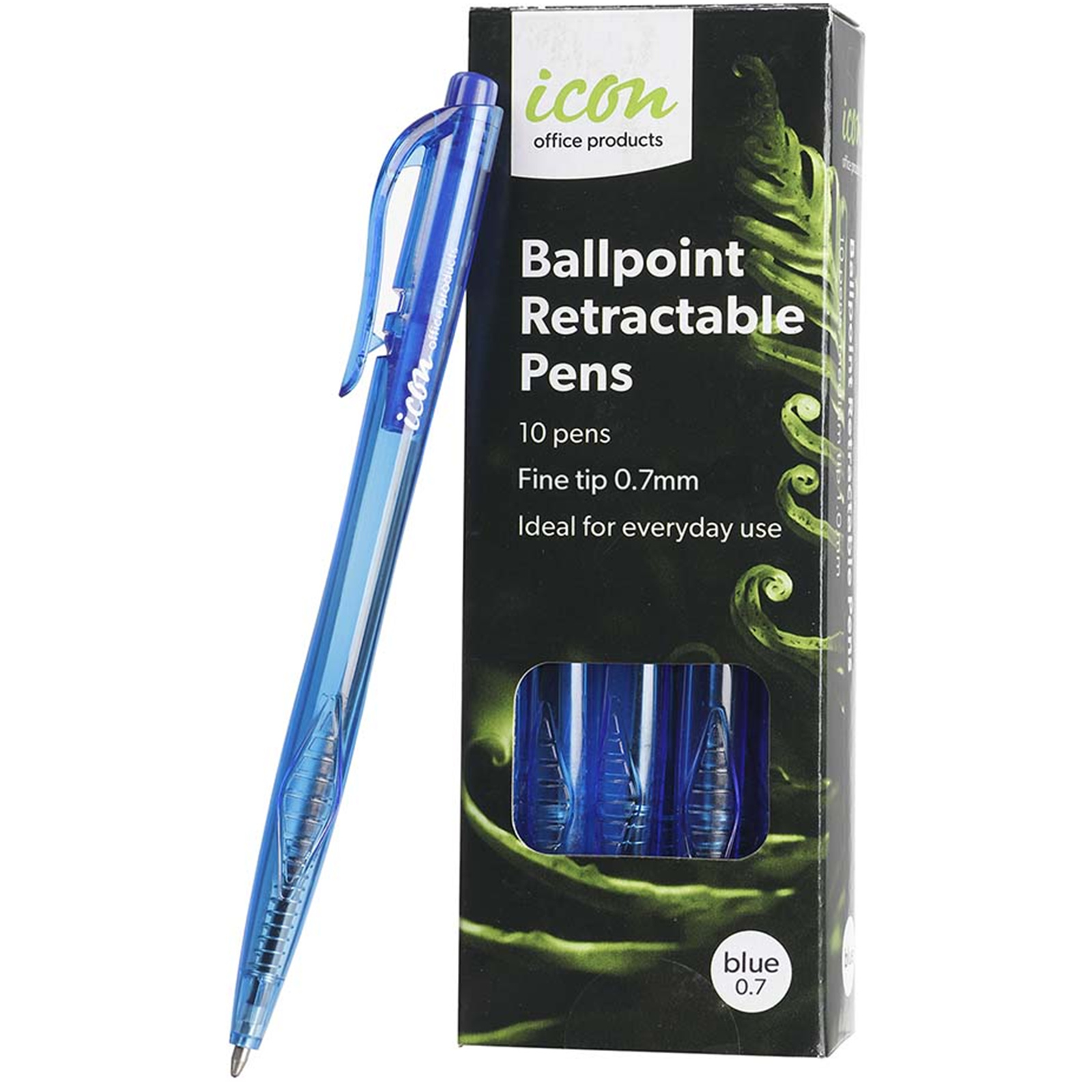 Icon Retractable Ballpoint Pens are an economical pen ideal for everyday use at work, home or school. They have a high quality ink that is waterproof and fadeproof. The fine tip provides smooth ink flow to avoid scratching and blotting. Blue. Fine tip 0.7mm. Pack of 10.