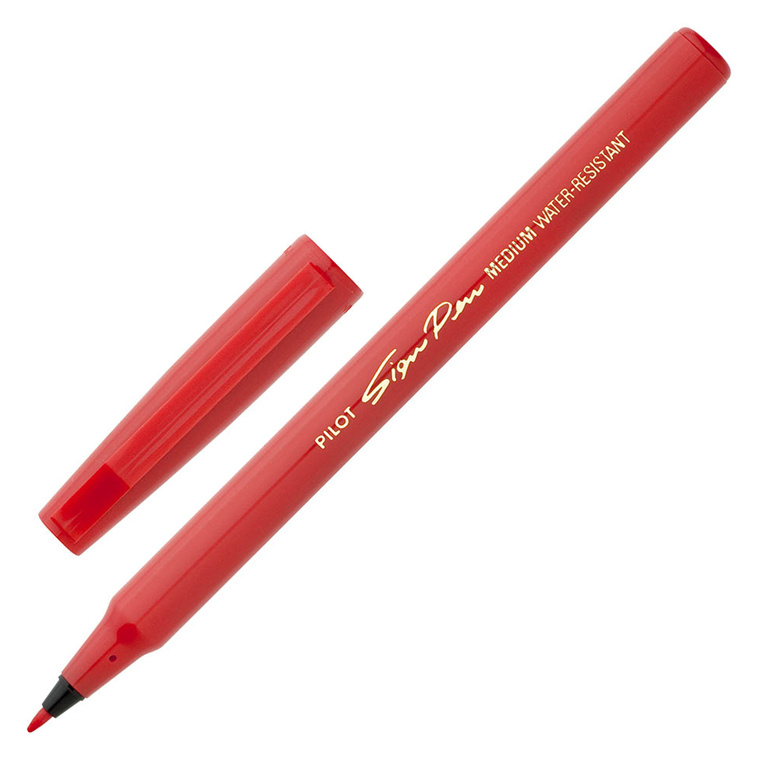 The traditional sign pen with a quality soft fibre tip, ideal for signatures, memos, etc. Ink is water and light resistant. 0.6mm tip size. Red ink. Purchase 12 to receive a box.