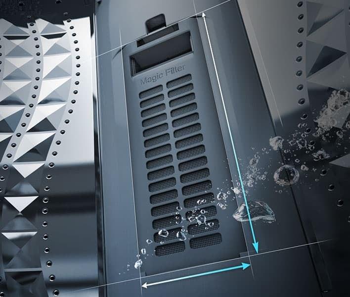 Keep unsightly speckles off your whites and darks, and protect the drainage from getting clogged up. A Magic Filter with a dual mesh, at the front and back, effectively gathers the lint, fluff and particles that come out of your laundry. And it is easy to empty out the filter, as it opens 180°.