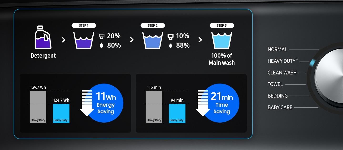 Enjoy highly concentrated detergent washing with the Heavy Duty+ cycle. It automatically starts washing using 20% more concentrated detergent for an intensive cleaning action. This allows it to reduce the washing time by 21 minutes* and energy consumption by 11%*, while offering the same washing performance.