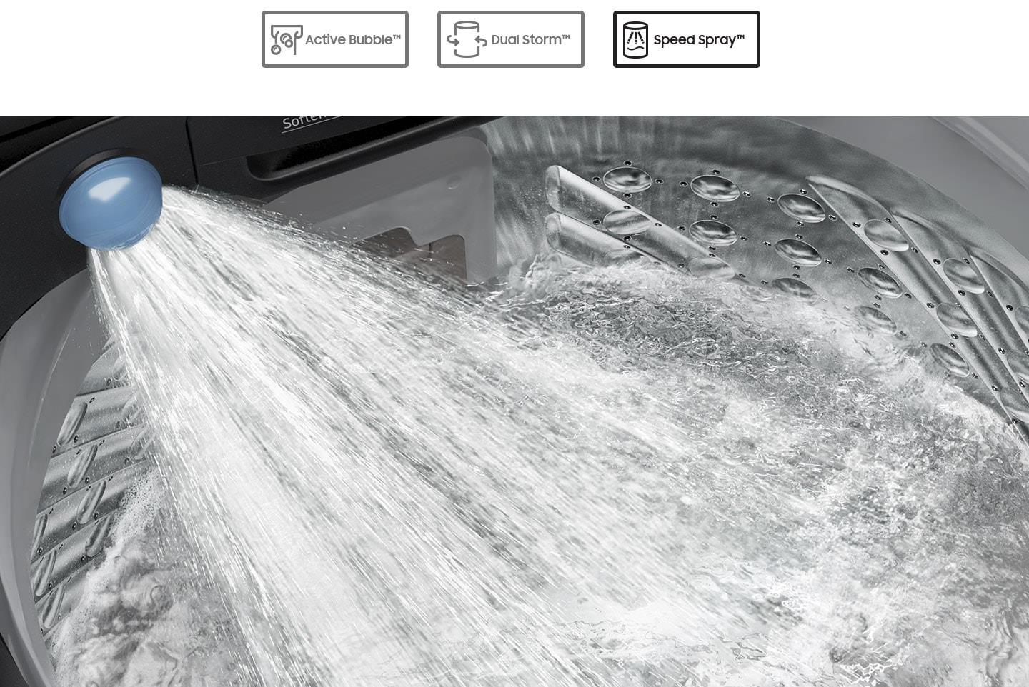 * Based on internal testing of the WA23A8377KV model with the Speed Spray™ option, using an IEC 3kg load (water level 3), compared to Normal course without the Speed Spray™ option. Results may vary depending on the actual usage conditions.