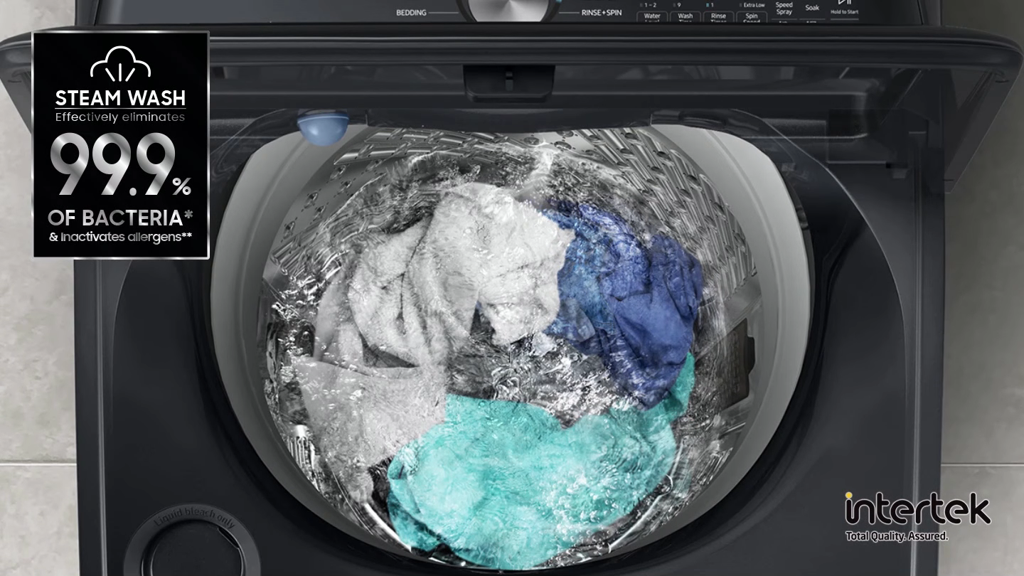 ** Based on internal testing, using Artificially Soiled Fabric (EMPA 120), compared to a Samsung conventional washing machine, WA22T7870KV. Results may vary depending on the actual usage conditions.