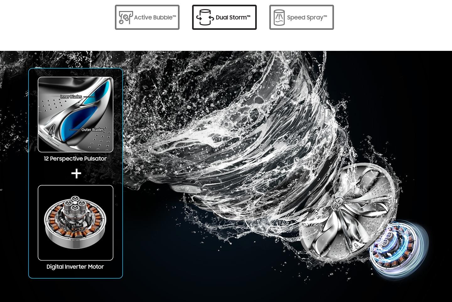 Wash faster and more efficiently with BubbleStorm™. Its 3 specialist functions clean clothes in 31 minutes*, using 20% less energy* and 23L less water*. Active Bubble™ helps detergent penetrate 2.5x faster**. A Dual Storm™ whirlpool cleans effectively, while Speed Spray™ reduces rinsing times.