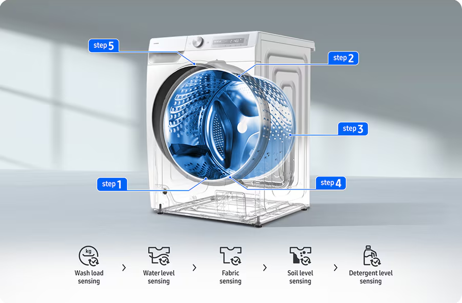 Wash clothes thoroughly* with less water and detergent. Al Wash senses the weight and softness of the fabric and the level of soiling. It then adjusts the water and detergent and the soaking, rinsing and spinning times. By analysing your washing pattern it can use less detergent**[2].