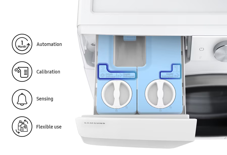 ** Compared to a regular Samsung auto dispenser, which is set to dispense the recommended amount of detergent. Based on the continuous analysis of the amount of detergent used in the last 10 cycles. Actual results may vary depending on individual use.