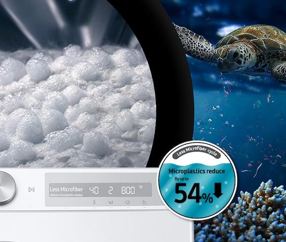 Samsung is finding solutions to the microfiber shedding problem. Samsung's specially designed laundry cycle reduces up to 54% of microfibers being released from your wash. This is just the first step toward healthier oceans.