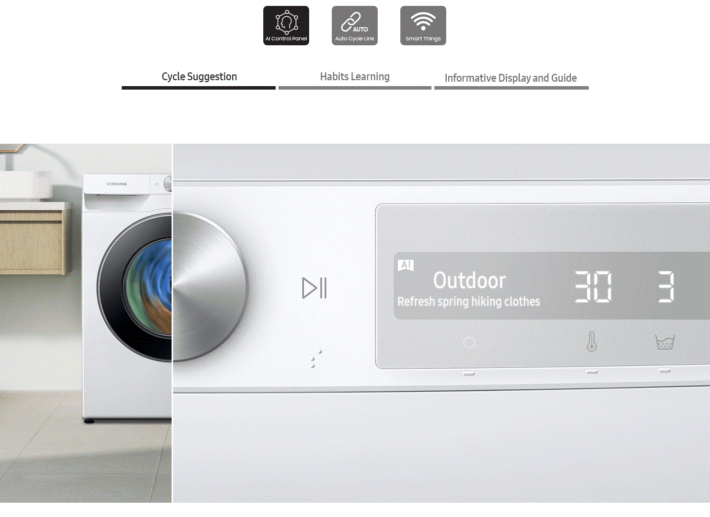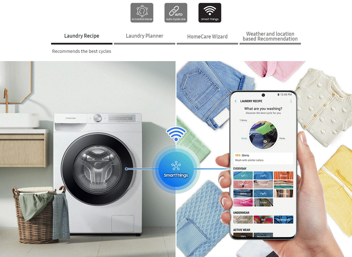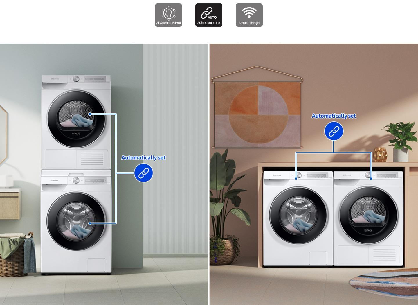 Wash easily and effectively with powerful Smart Control. It personalizes washing by remembering your habits, suggesting cycles and displaying timely information. A SmartThings App* provides advice on cycles, planning and troubleshooting. And it automatically selects the perfect drying course**.