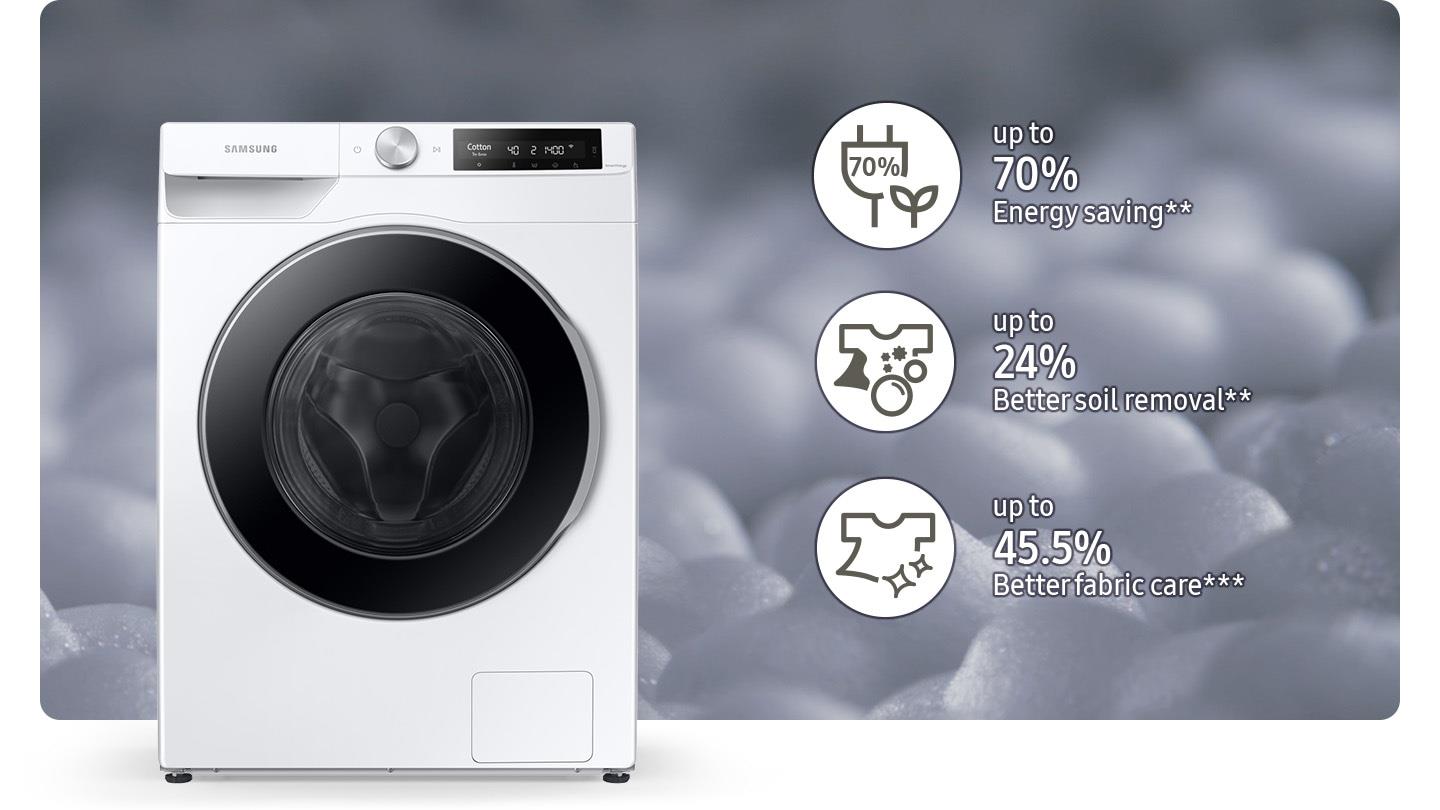 Enjoy more effective washing with BubbleWash™*. It creates bubbles that remove 24%** more soil even at low temperatures, saving 70% energy** and ensuring 45.5% better fabric care***. It also detects the fabric type and optimises the amount of bubbles, washing time, temperature and spin speed.