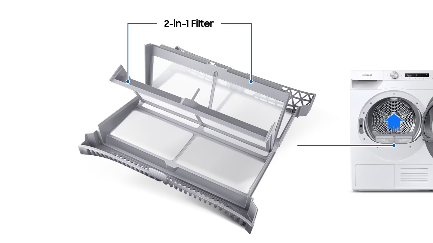 Maintain your dryer easily and optimise drying performance and safety. This innovative filter has a multi-layered mesh, eliminating the need for a Heat Exchanger filter. This makes the dryer easy to maintain. Two alarms also remind you when the Filter and Heat Exchanger need cleaning.