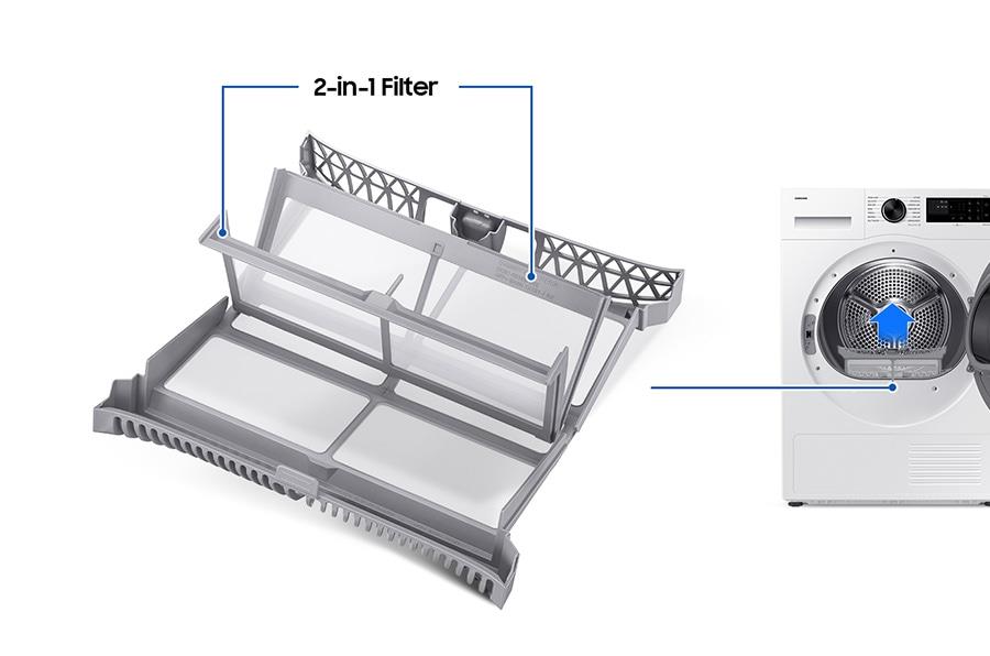 Maintain your dryer easily and optimise the drying performance and safety. The 2-in-1 Filter's two-layered mesh filter traps dust and fibers. So there is no need for a Heat Exchanger filter. Two alarms also remind you when the Filter and Heat Exchanger need cleaning.