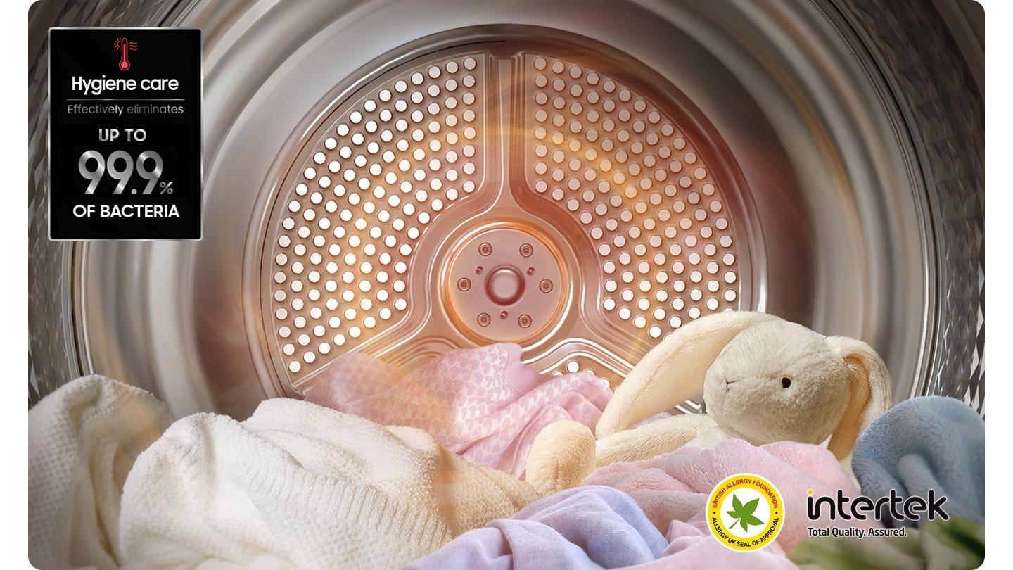 Prevent the build-up of bacteria on clothes and other items, like linen and children's soft toys. The Hygiene Care cycle sanitises both dry and wet items* without affecting the drying performance. By infusing them with high temperature heat while drying it eliminates 99.9% of bacteria**.[1]