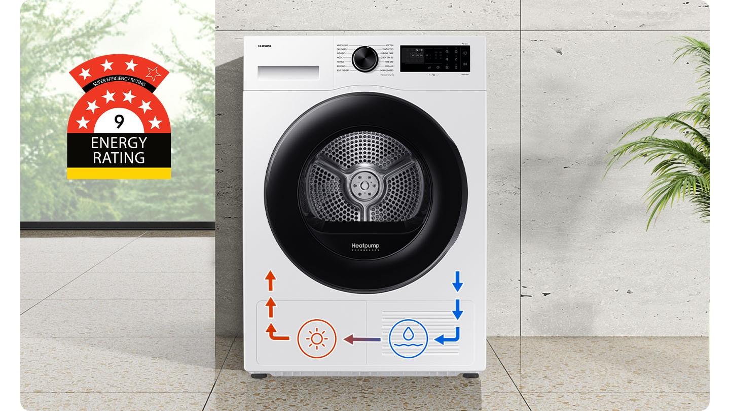 Heat Pump Technology offers a gentle and efficient way to dry clothes. It has an impressive 9-star rating for energy efficiency because it uses a 'refrigerant' to heat the air, instead of electricity and recycles air which can help reduce energy usage.