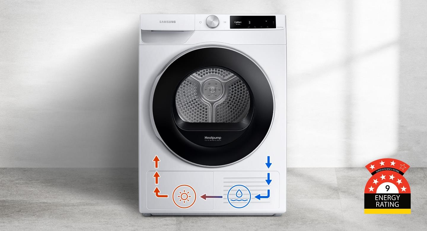 Heat Pump Technology offers a gentle and energy-efficient way to dry clothes*. Its impressive 9-star rating for energy efficiency uses a 'refrigerant' to heat the air, instead of electricity. It also recycles warm air to help reduce energy usage.