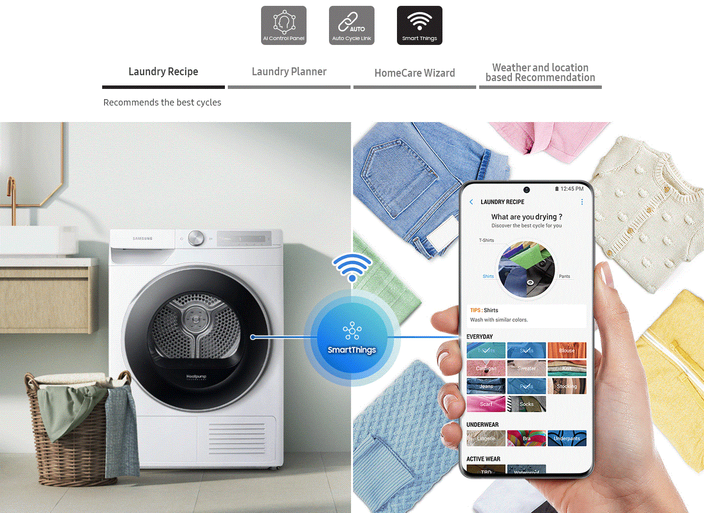 SmartThings App* provides advice on cycles, planning and troubleshooting, and it selects the perfect drying course for a wash cycle**.