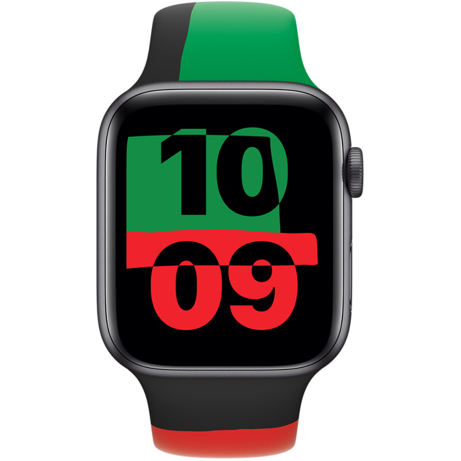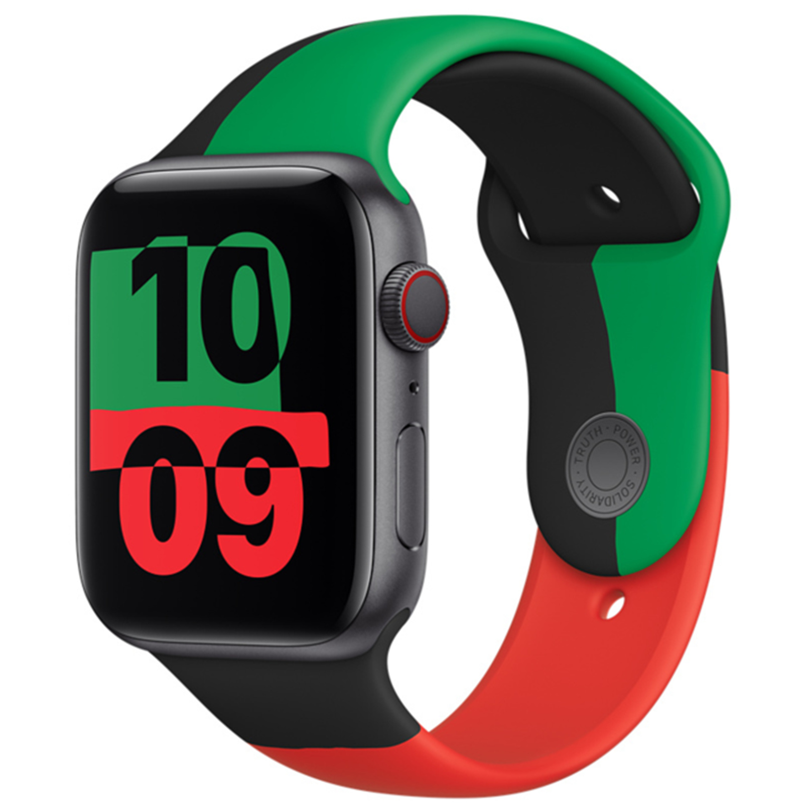 Designed by Black creatives and allies throughout Apple to celebrate and acknowledge Black history and culture, the Black Unity Sport Band is inspired by the colours of the Pan-African flag and pays homage to the rich tradition and craft of quilt-making. Three individual pieces of coloured fluoroelastomer are assembled by hand and compression-moulded as one. Complemented by the dynamic Unity watch face, which displays an ever-changing pattern of irregular shapes as Apple Watch moves, these colours are brought together in a unique tapestry. The innovative pin-and-tuck closure is laser-etched with "Truth. Power. Solidarity."