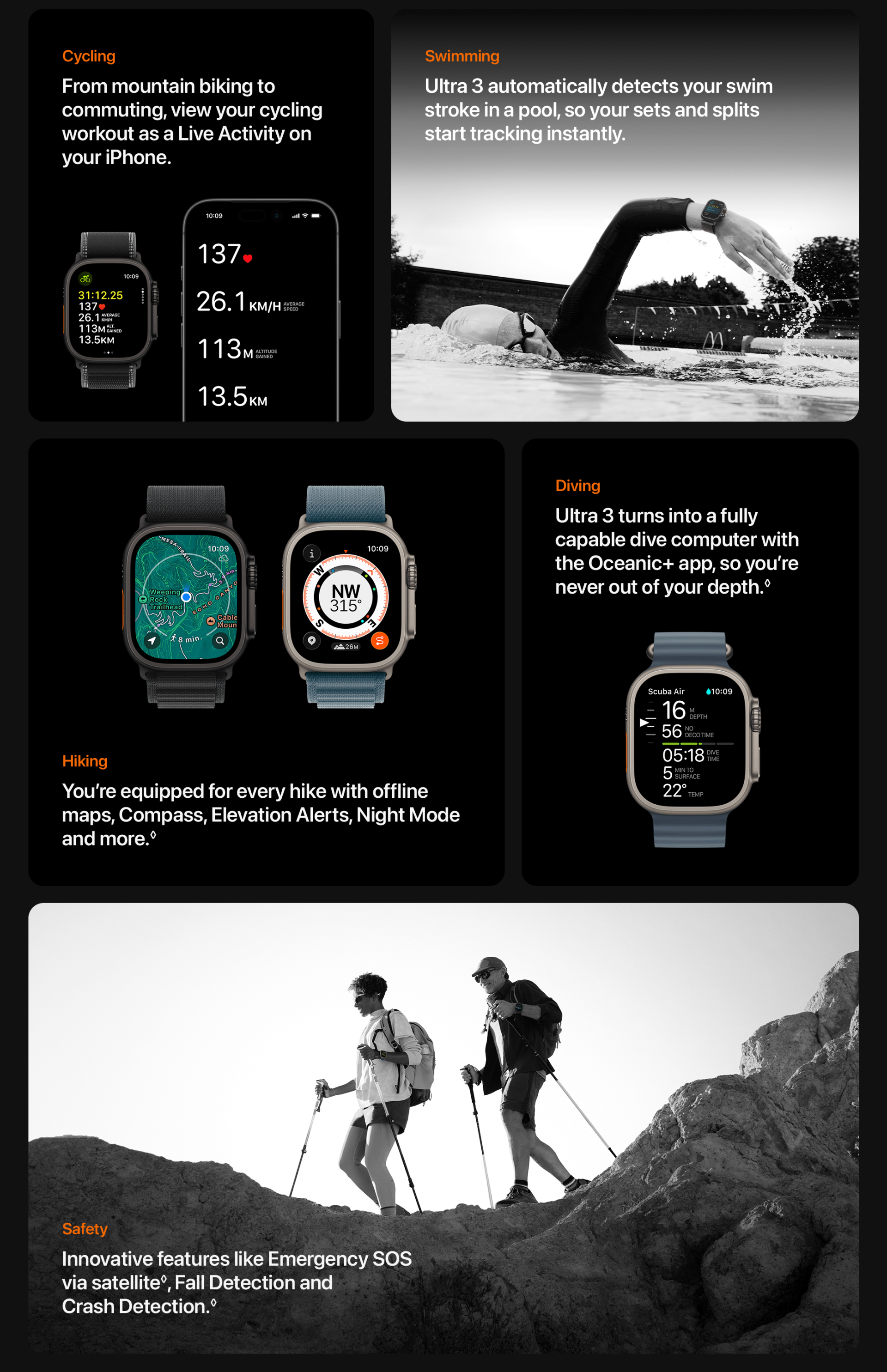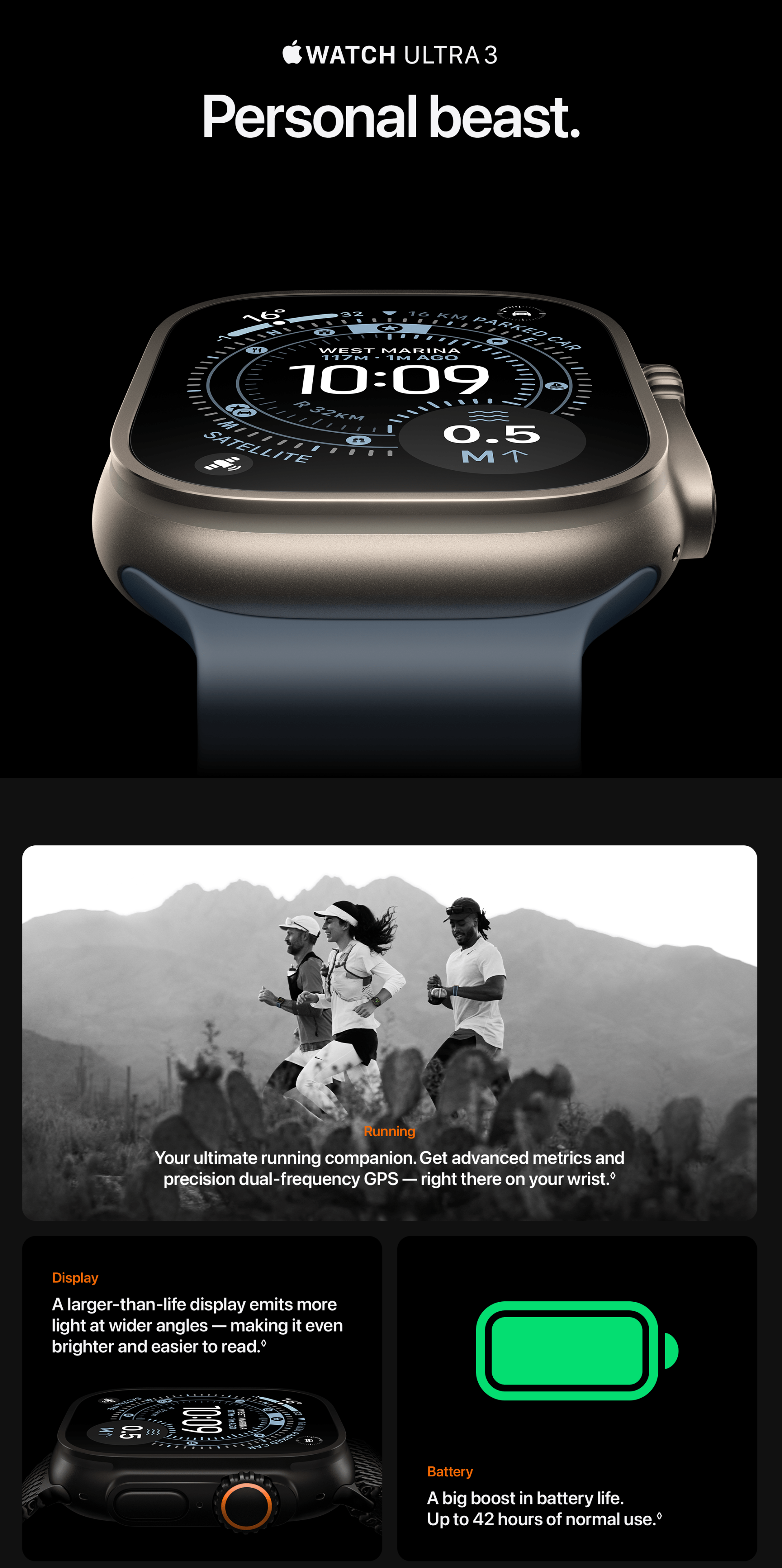 Satellite: Emergency SOS and Find My via satellite are included for free for two years with the activation of Apple Watch Ultra 3. Connection and response times vary based on location, site conditions and other factors. Find My via satellite requires a carrier plan. Satellite connectivity is provided by Globalstar and its affiliates. See support.apple.com/123924 for more information.
