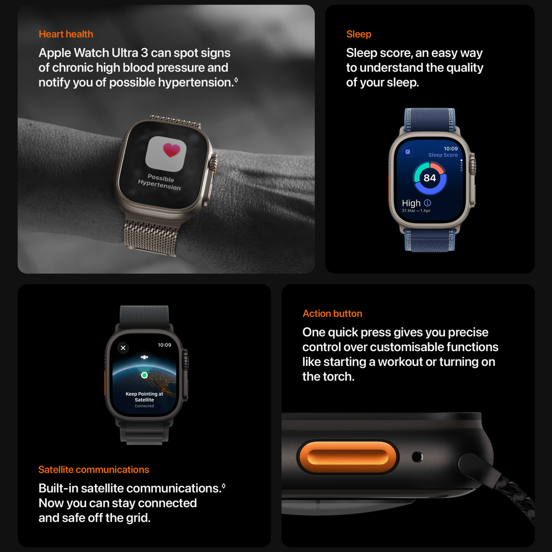 8. Multi-day battery life including sleep tracking is based on the following use: 600 time checks, 180 notifications, 30 minutes of app use, a 60-minute workout with music playback from Apple Watch via Bluetooth, and 6 hours of sleep tracking over the course of 42 hours; Apple Watch Ultra 3 usage includes a total of 8 hours of mobile network connection and 34 hours of connection to iPhone via Bluetooth over the course of 42 hours. Battery life in Low Power Mode including sleep tracking is based on the following use: 900 time checks, 270 notifications, 45 minutes of app use, two 60-minute workouts with music playback from Apple Watch via Bluetooth, and 18 hours of sleep tracking over the course of 72 hours; Apple Watch Ultra 3 usage includes on-demand mobile network connection and 60 hours of connection to iPhone via Bluetooth over the course of 72 hours. Testing conducted by Apple in July and August 2025 using preproduction Apple Watch Ultra 3 paired with an iPhone; all devices tested with prerelease softwareBattery life varies by use, configuration, mobile network, signal strength and many other factors; actual results will vary.