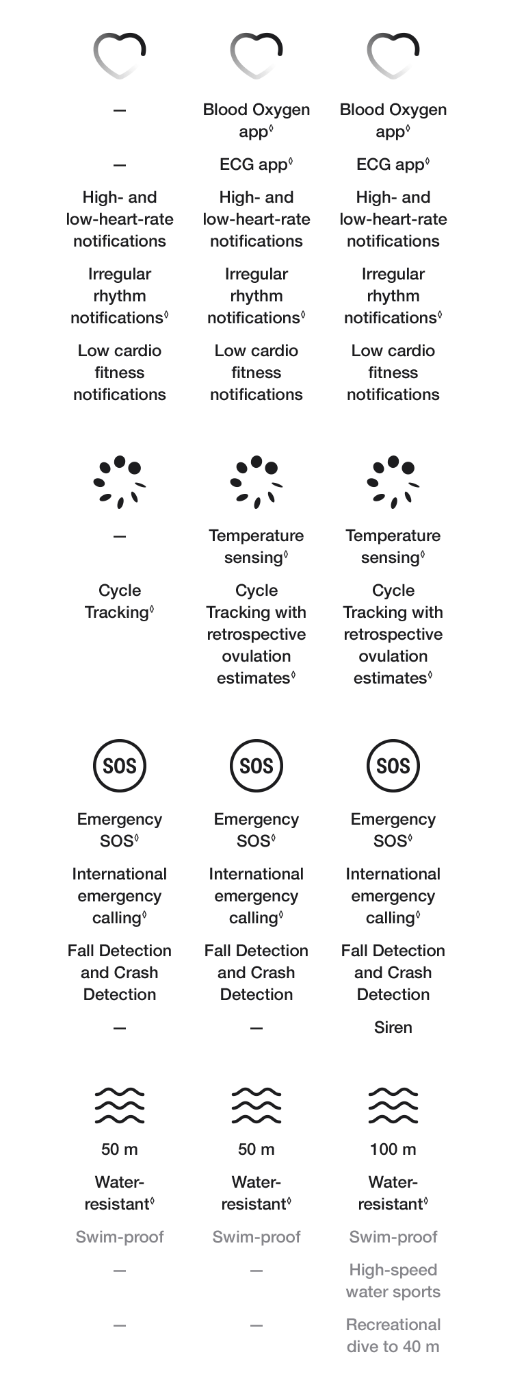 Accelerometer, gyro, heart rate, barometer, always-on altimeter (-500m to 9000m), compass, SpO2, VO2max, temperature (body), temperature (water)