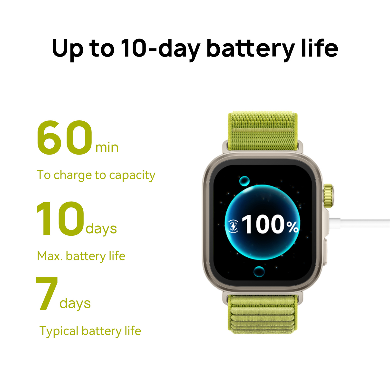 The maximum battery life is tested under the following conditions: default settings, 30 minutes of Bluetooth calling per week, 30 minutes of music playback per week, heart rate monitoring always on, HUAWEI TruSleep™ enabled at night, 90 minutes of exercise on average per week, message notifications enabled (50 messages, 6 calls, and 3 alarms per day), and the device screen turned on 200 times per day.
