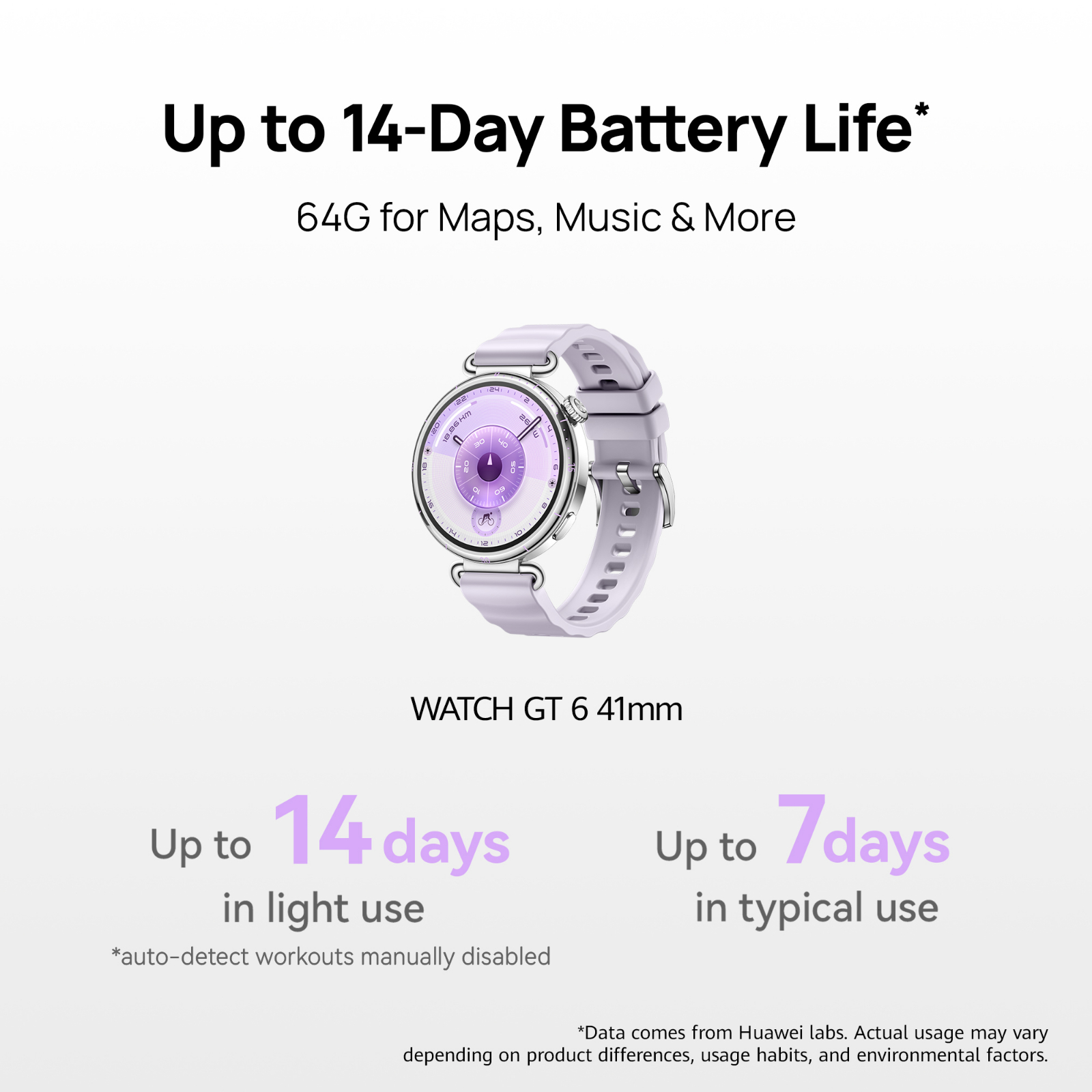 HUAWEI WATCH GT 6 41 mm: The battery can last for up to 14 days at most, up to 7 days given typical usage, or up to 5 days with AOD enabled, and up to 25 hours in the outdoor sport mode.