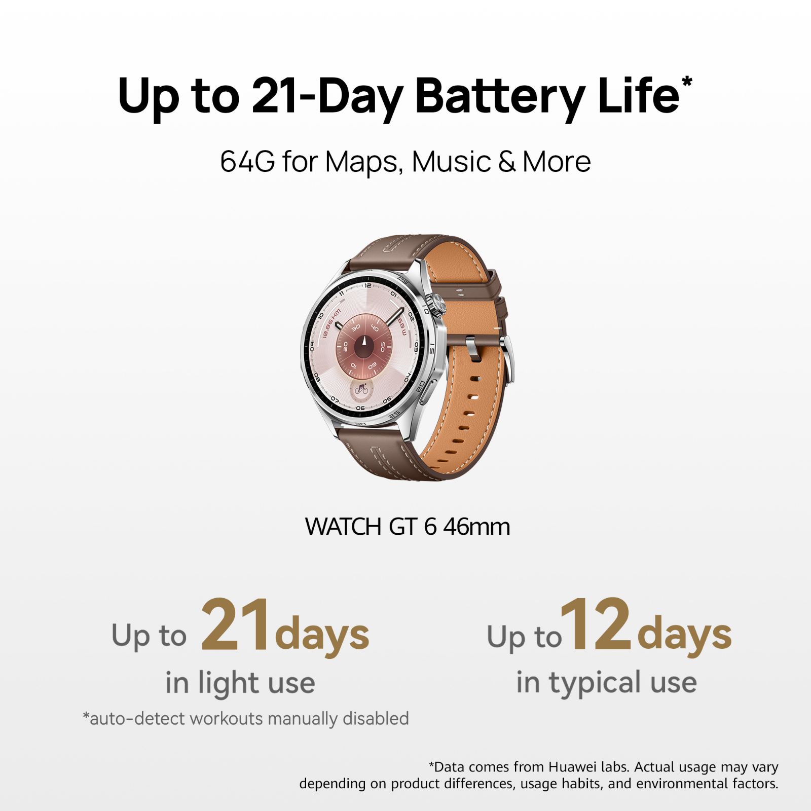 HUAWEI WATCH GT 6 46 mm: The battery can last for up to 21 days at most, up to 12 days given typical usage, or up to 7 days with AOD enabled, and up to 40 hours in the outdoor sport mode.