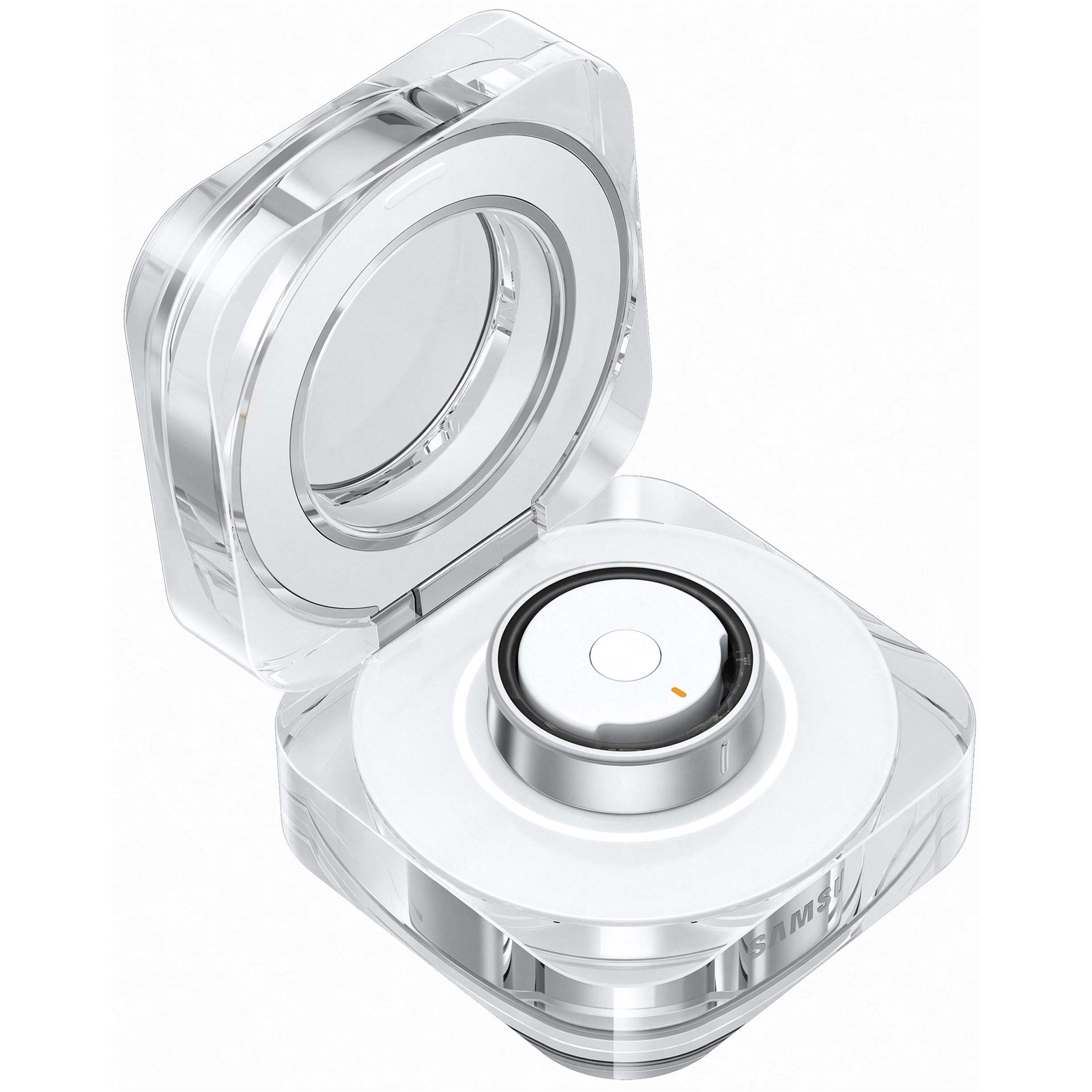 Even while charging in its crystal-clear Charging Case, the Galaxy Ring is a sight to behold. The delicate glow of the light around the Multi-purpose button indicates the battery charging level. The Charging Case can be charged wirelessly too, so simply place your Galaxy Ring securely in its case when you're on the go, and place it on a wireless charging pad for easy charging. [14, 15, 16]