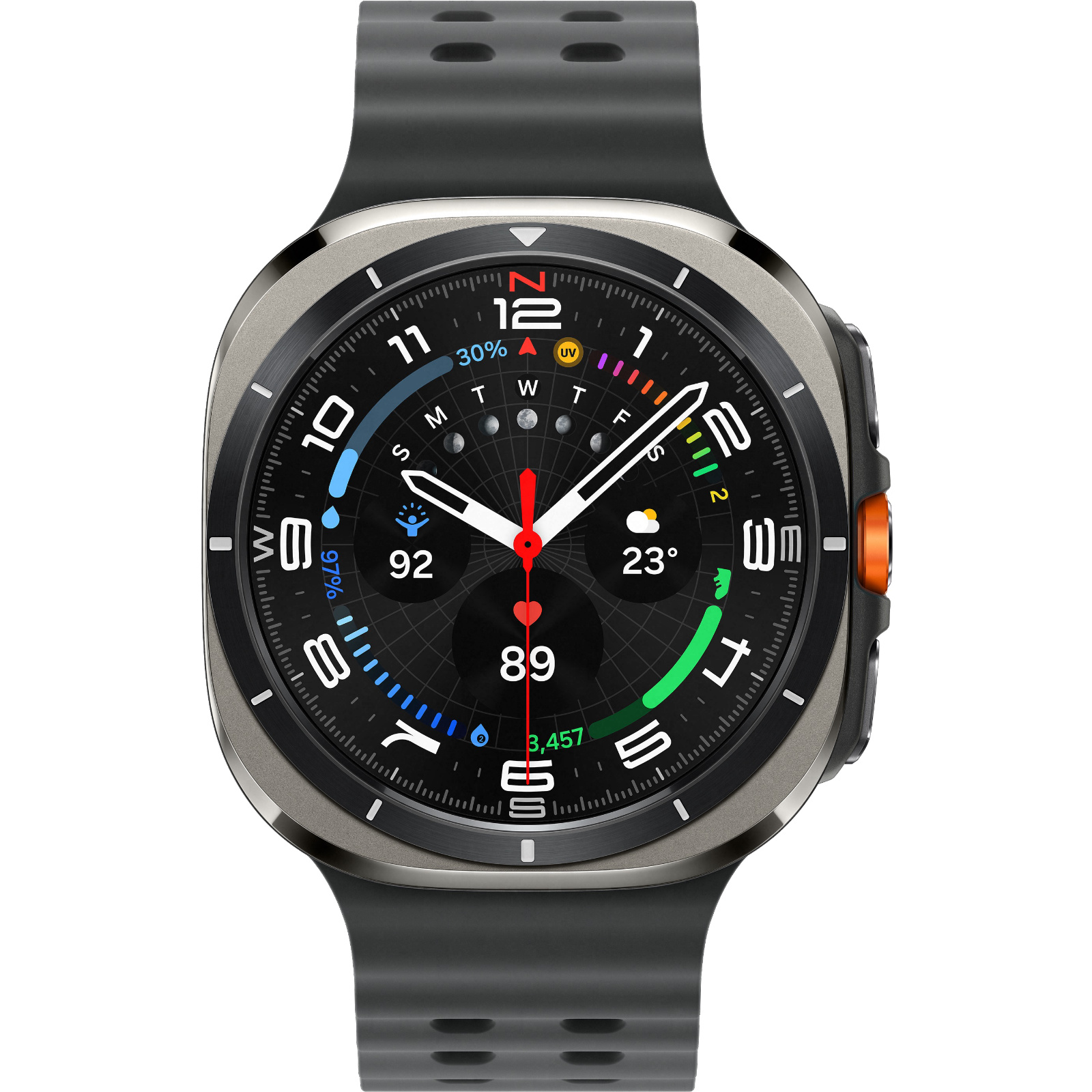 *Image simulated. Samsung account login and internet connection may be required for certain AI features. Galaxy AI feature availability and associated costs are subject to change post 2025. AI output, reliability and accuracy not guaranteed. Actual UI may be different. Galaxy Watch Ultra is water resistant with an IPx8 rating assessed independently under specification ISO 22810:2010. Assessed under lab conditions. Water resistant up to 1.5m for up to 30 min, and 100m for up to 10 min. Not suitable for high-pressure water activities and diving. Water resistance is not a permanent condition and can diminish over time. Accuracy of results not guaranteed and may vary in a real world environment. Exposure or prolonged exposure to high pressure and other real world environmental elements may affect availability of some features and functions. Rinse thoroughly in fresh water after exposure to salt, sugar, chlorinated water, or liquid containing salt or sugar. Refer to the user manual for further information, including care/use instructions.