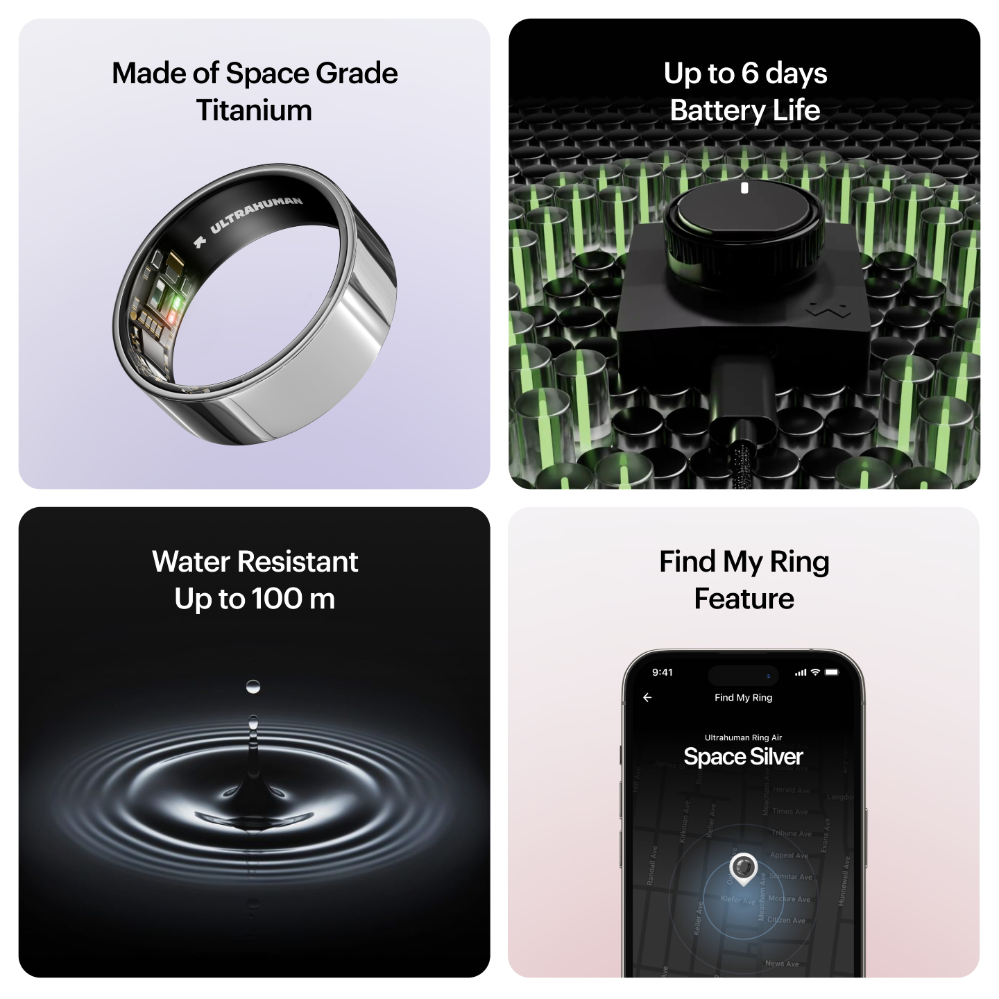 The Ultrahuman Ring is crafted from space-grade titanium, offering unmatched strength and lightweight comfort. It's water-resistant up to 100m, making it perfect for everyday wear, workouts, and even swimming.