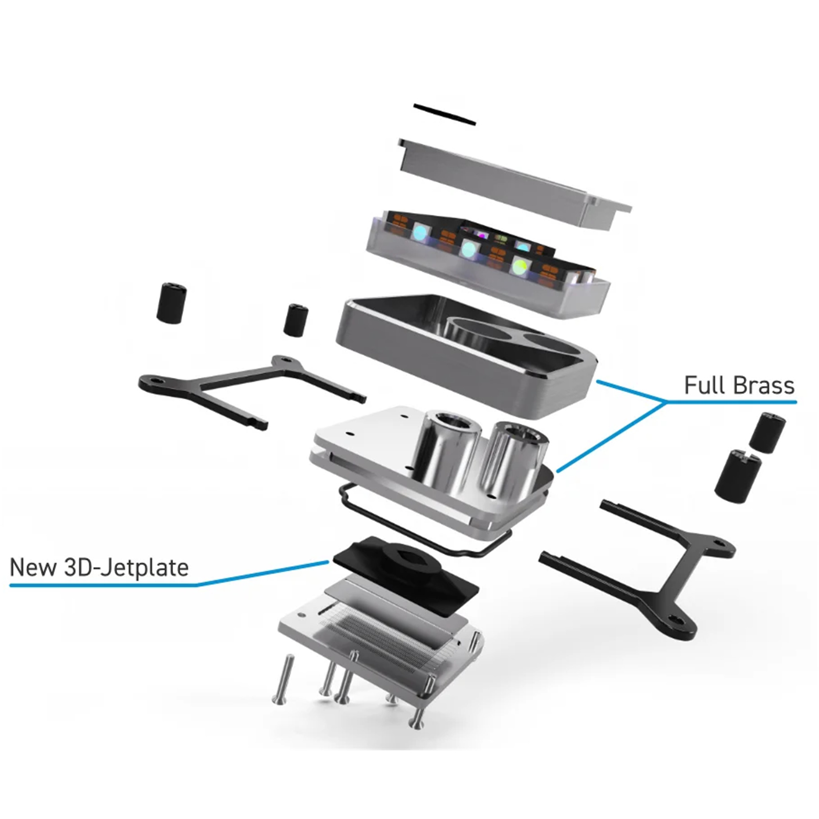 Alphacool brings the best of both worlds together with the Core 1. In addition to the new 3D-Jetplate, Alphacool returns to its roots by using a proven cross-slot technique to distribute coolant evenly across the redesigned cooler base. Inside the cooler, O-rings ensure precise water flow for effective cooling. The Core 1's housing is machined from a high-quality brass block and features nickel-plated connectors. The cooler's copper base, also nickel-plated, has been enlarged to ensure full coverage of large CPUs.
