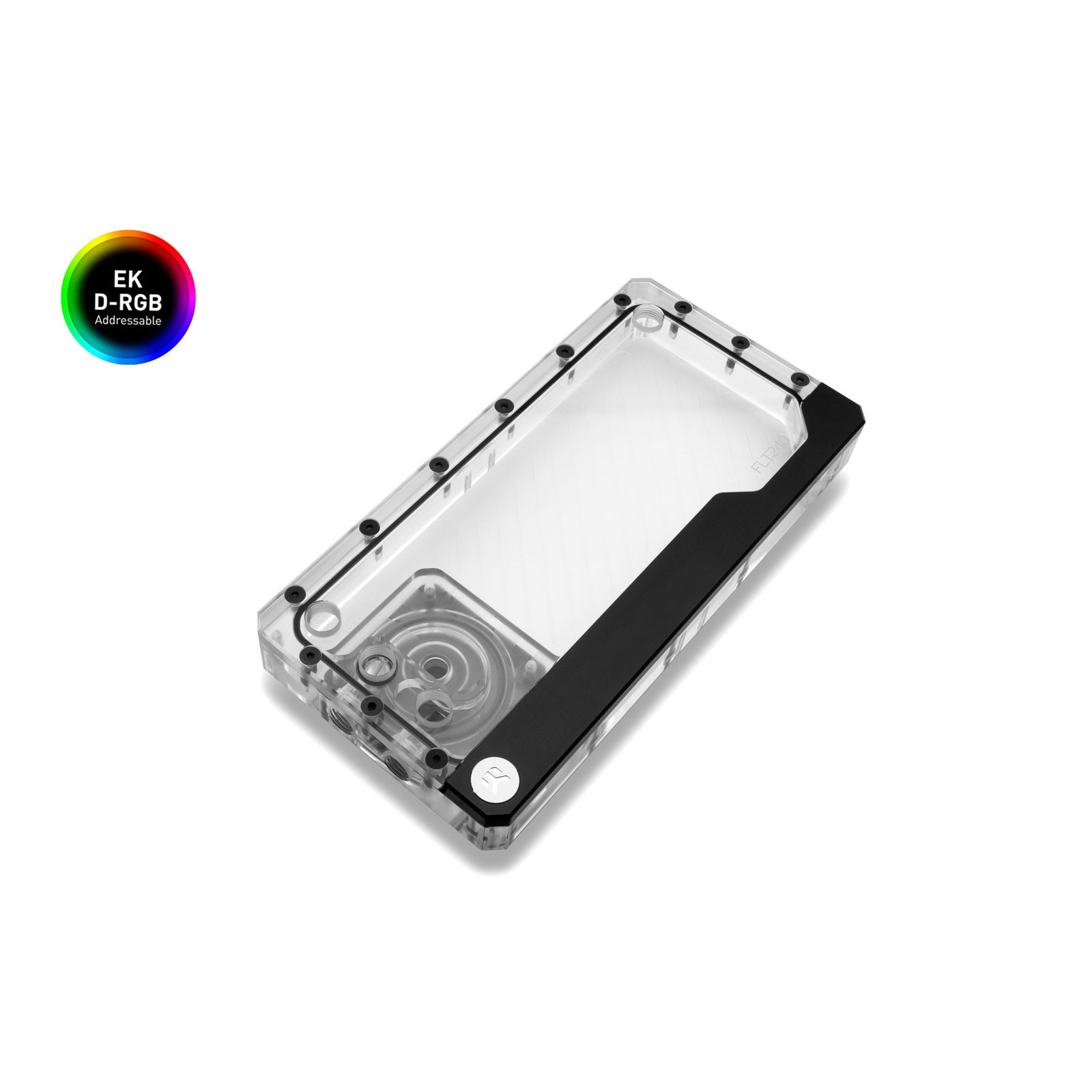 The reservoir is manufactured of premium quality acrylic material, machined to perfection, while the sealing is performed by a quality EPDM o-ring. Alongside the reservoir is a black anodized aluminum cover under which the Addressable D-RGB LED strip is placed. Proper LED implementation is one of the main focus points of EK so that there are as few visible "LED hotspots" as possible.