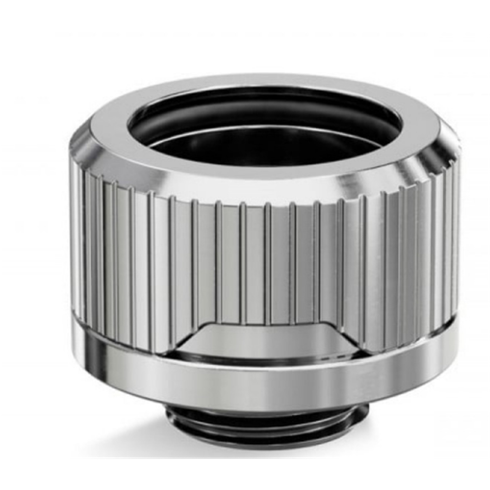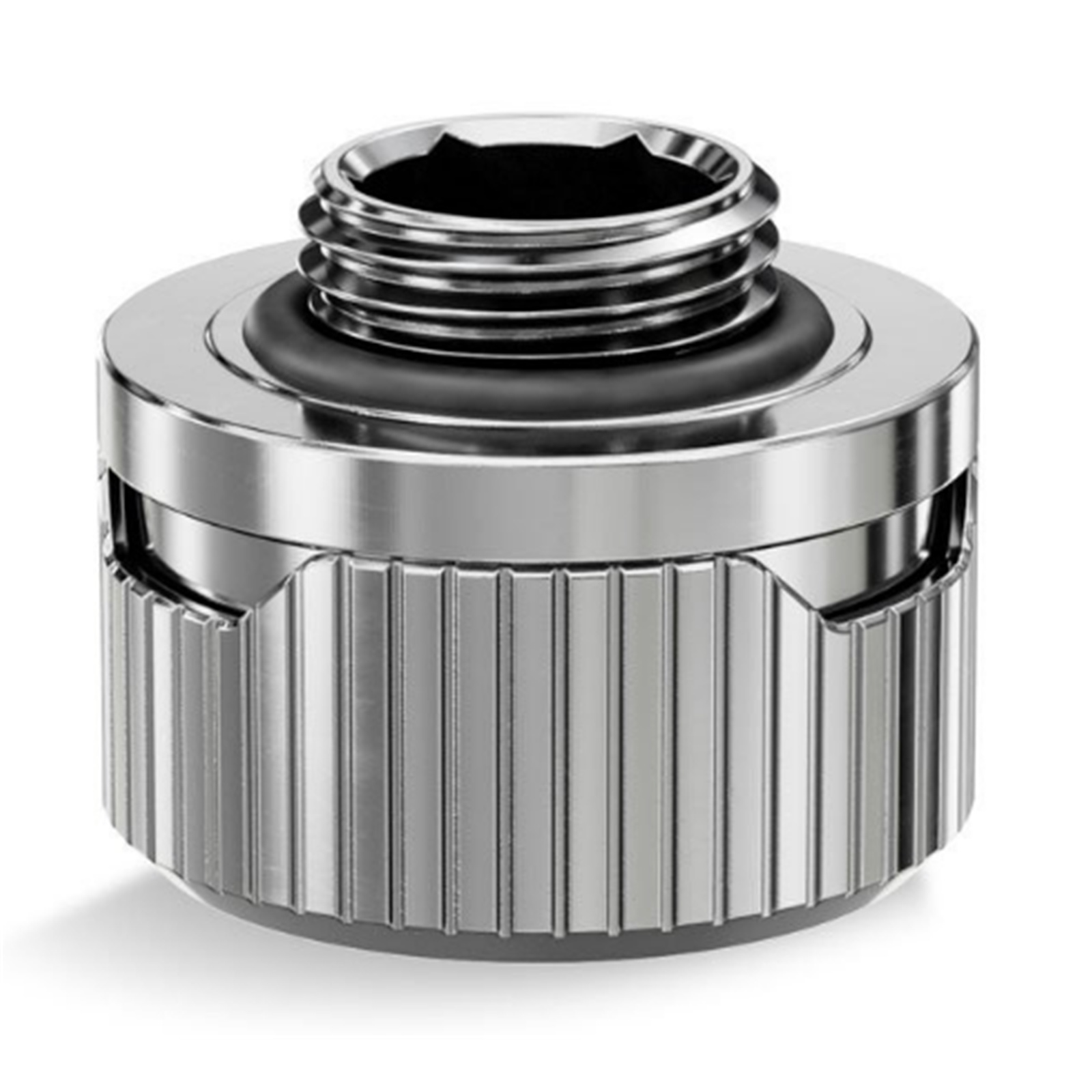 The locking ring prevents the solid tube from being pulled out of the fitting by compressing the rubber gasket underneath the ring. The grooves on the outside allow for easier hand tightening. The compression ring has cutouts in the EK Quantum signature shape allowing for the colored aesthetic ring to be shown. The colored rings are available in many colors and are screwed onto the fitting before the compression locking ring. The aesthetic rings are sold separately.
