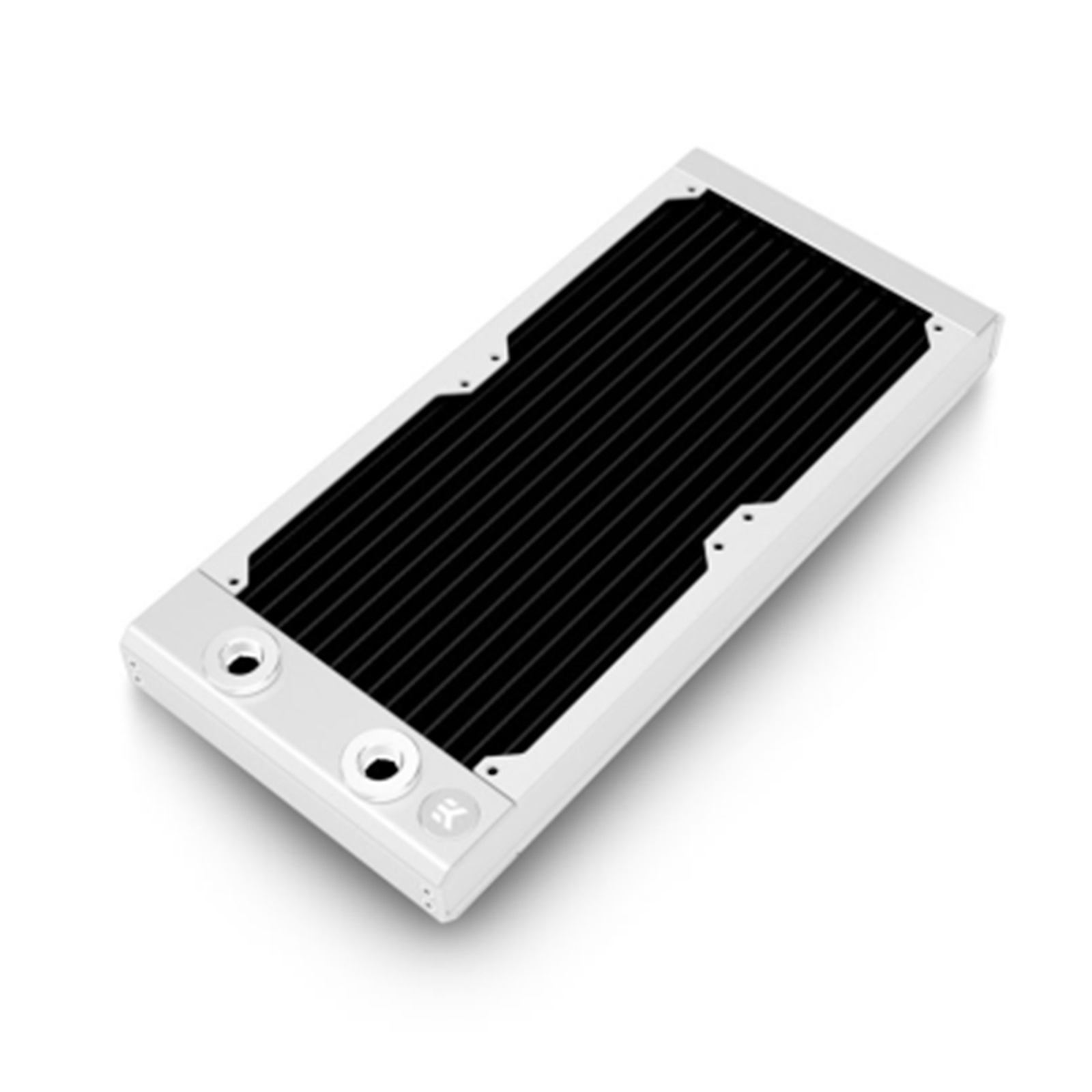 Thick, extruded aluminum end caps with a contrasting silver finish give the radiator a premium look and feel. They cover the internals and join the stamp-pressed side plates, creating a rigid structure that is pleasant to handle. The stainless-steel side plates are coated with a durable semi-matte white paint, while the fins themselves have a special black matte coating with a high thermal conductivity coefficient. The shade of white is carefully picked to match some of the most popular white cases on the PC market.