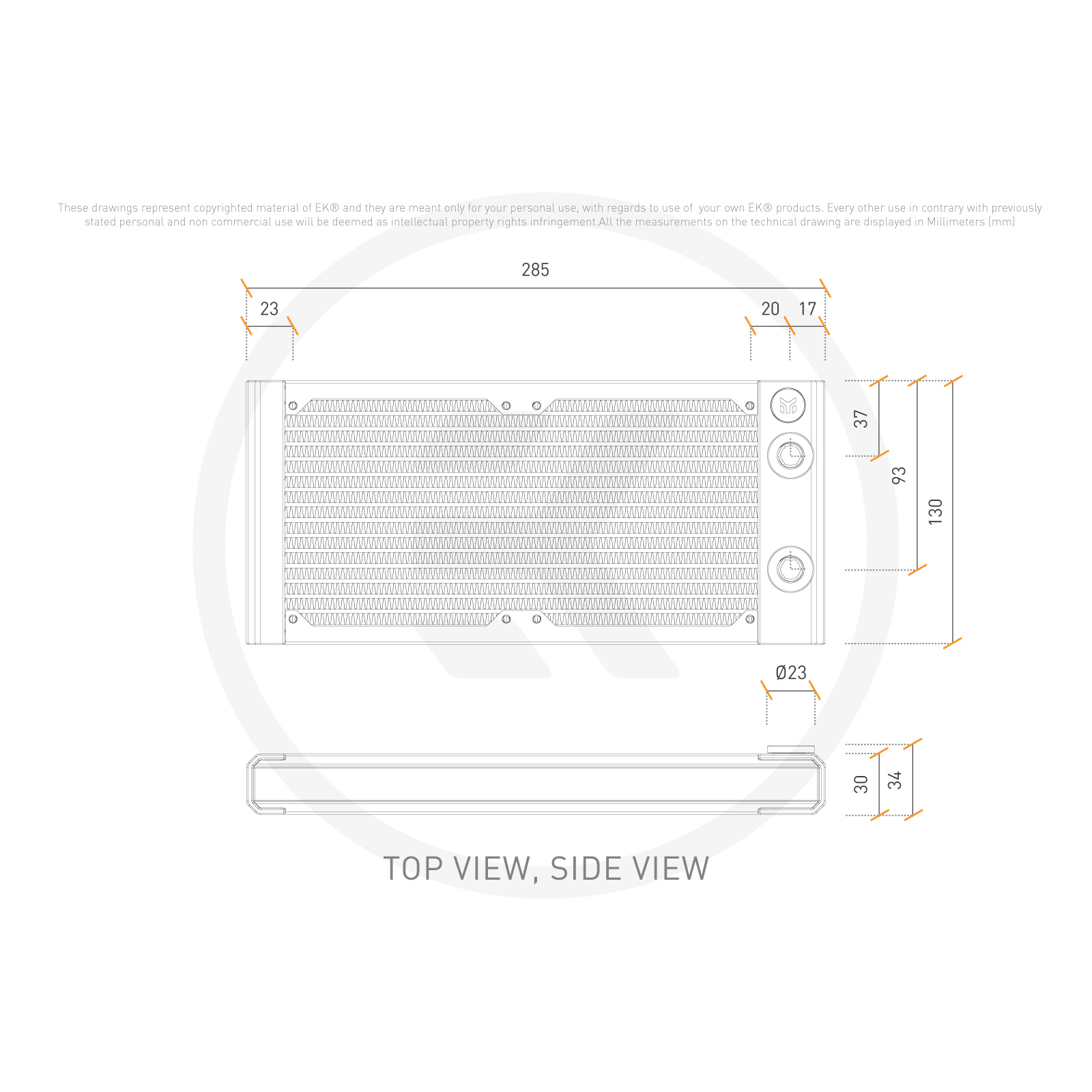 With a thickness of only 30mm, the EK-Quantum S Series Surface radiators are ideal for space-constrained cases. Despite the reduced thickness, they deliver exceptional performance at very low and medium fan speeds. A total of 16 copper 2mm wide tubes across the entire length of the radiator assure optimal coolant flow putting no stress on your cooling loop. High-grade non-louvered copper fins with 20 FPI density provide the best balance between thermal transfer and air resistance for optimal performance even at low-speed fan operation. A Push/Pull setup on an S Series EK-Quantum Surface radiator is not something EK would recommend since it will not bring a proportional performance increase. If more cooling power is needed, adding additional radiators is the way to go.