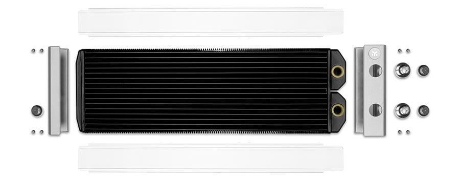Thick, extruded aluminum end caps with a contrasting silver finish give the radiator a premium look and feel. They cover the internals and join the stamp-pressed side plates, creating a rigid structure that is pleasant to handle. The stainless-steel side plates are coated with a durable semi-matte white paint, while the fins themselves have a special black matte coating with a high thermal conductivity coefficient. The shade of white is carefully picked to match some of the most popular white cases on the PC market.
