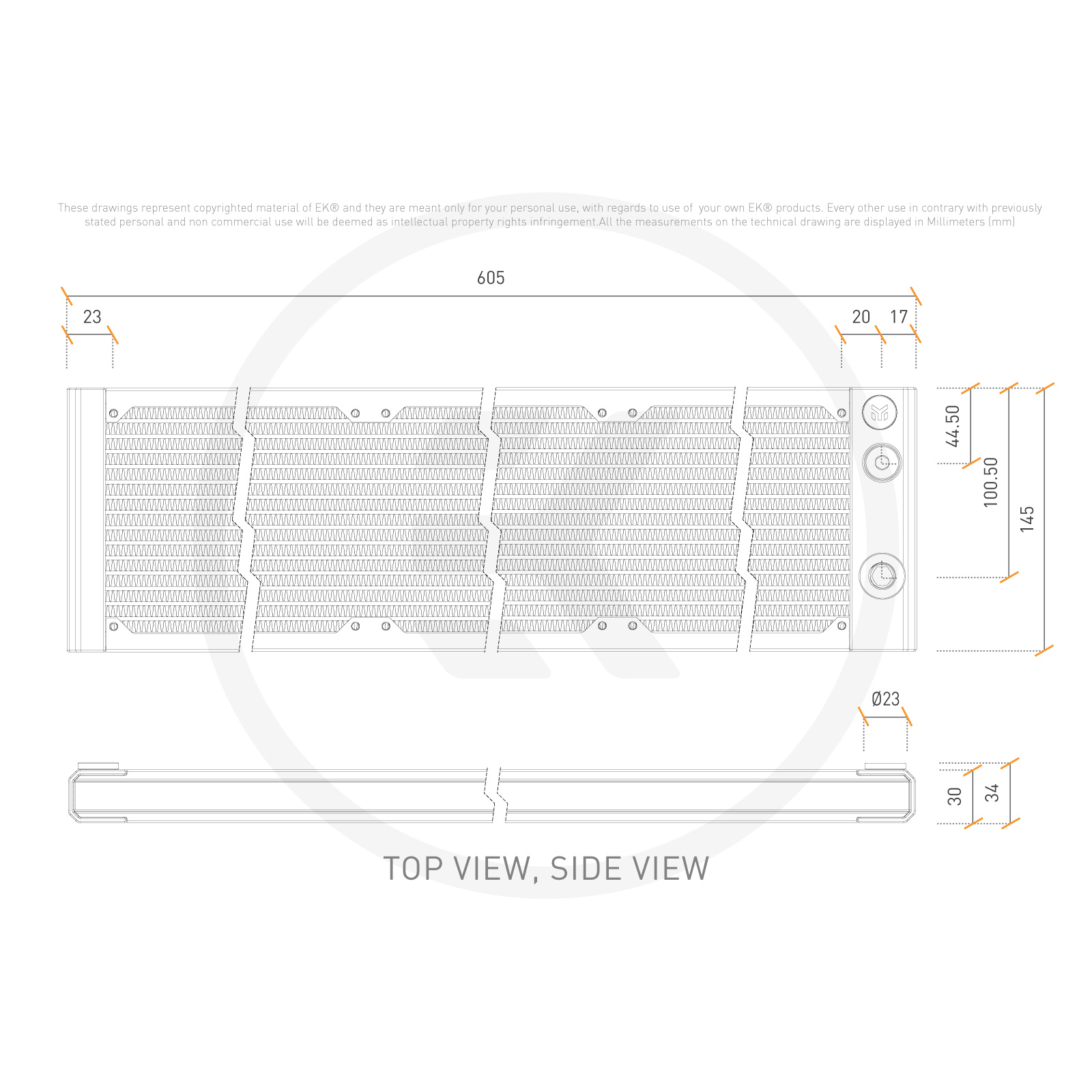 With the supplied screws, this radiator is compatible with 140mm fans that have a standard 25mm thickness. EK recommends using EK fans or similar ones with sealed-edge frames. This classic yet effective square shape of the fan casing provides optimal performance in either the pull (suction) or push (pressure) regime without any hydraulic losses, thus ensuring the optimal cooling capacity of your liquid cooling radiators.