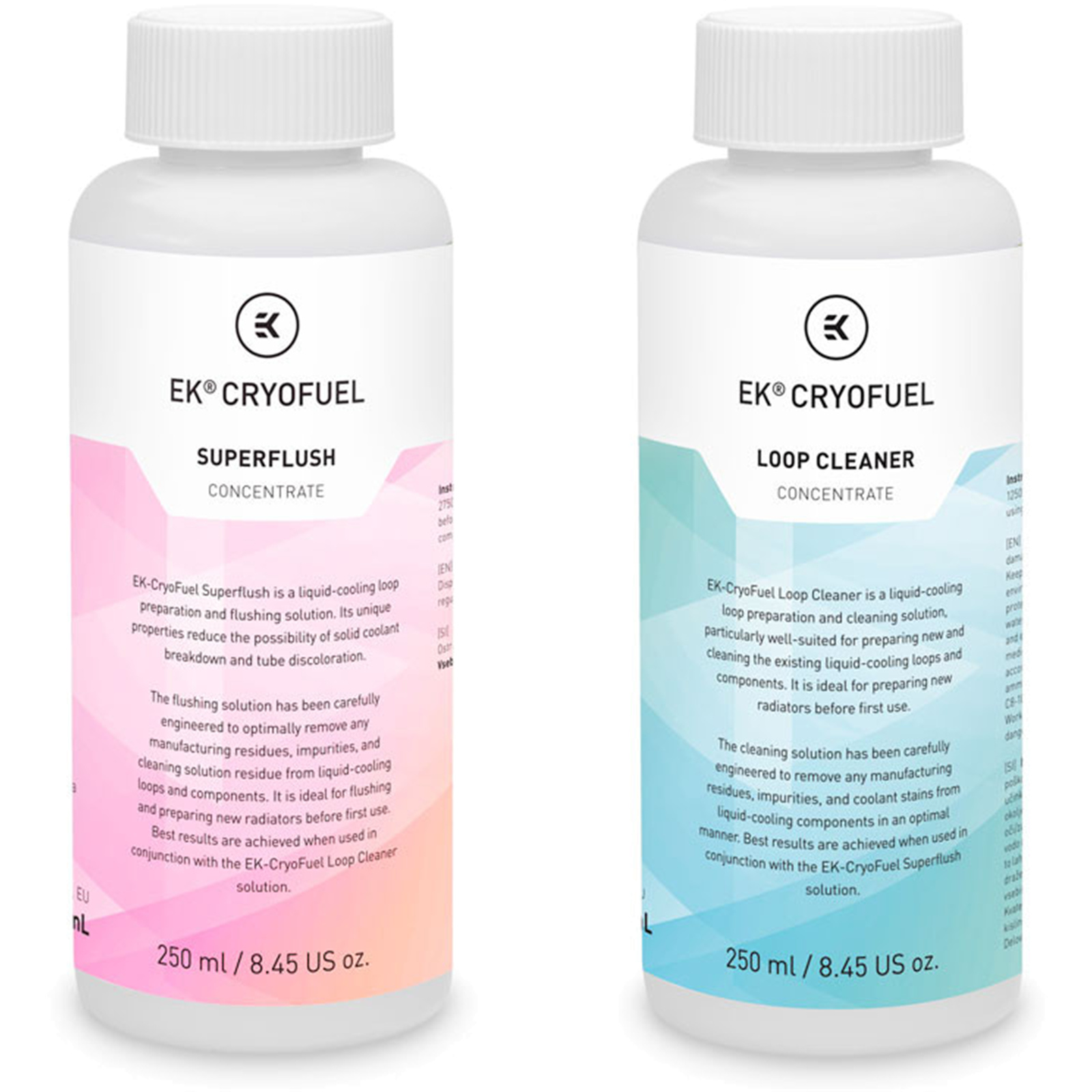 EK-CryoFuel Loop Cleaner + Superflush is a safe and reliable loop-cleaning and flushing kit. It has been developed to clean your used custom water cooling loop or prepare a new one, leaving it free of any impurities or manufacturing residues. It consists of two items, of which both are concentrates and require dilution with distilled water before use.