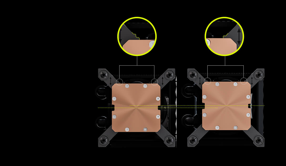 Through a unique structural design, small adjustments to the water block position can be made without replacing the mounting components.