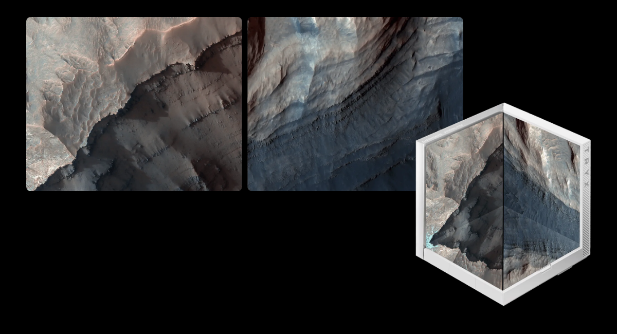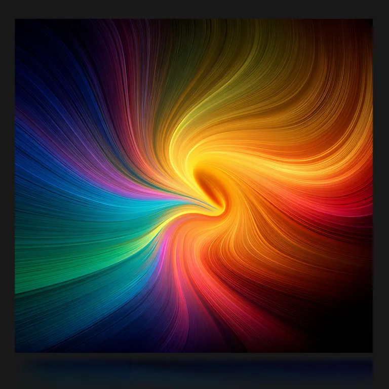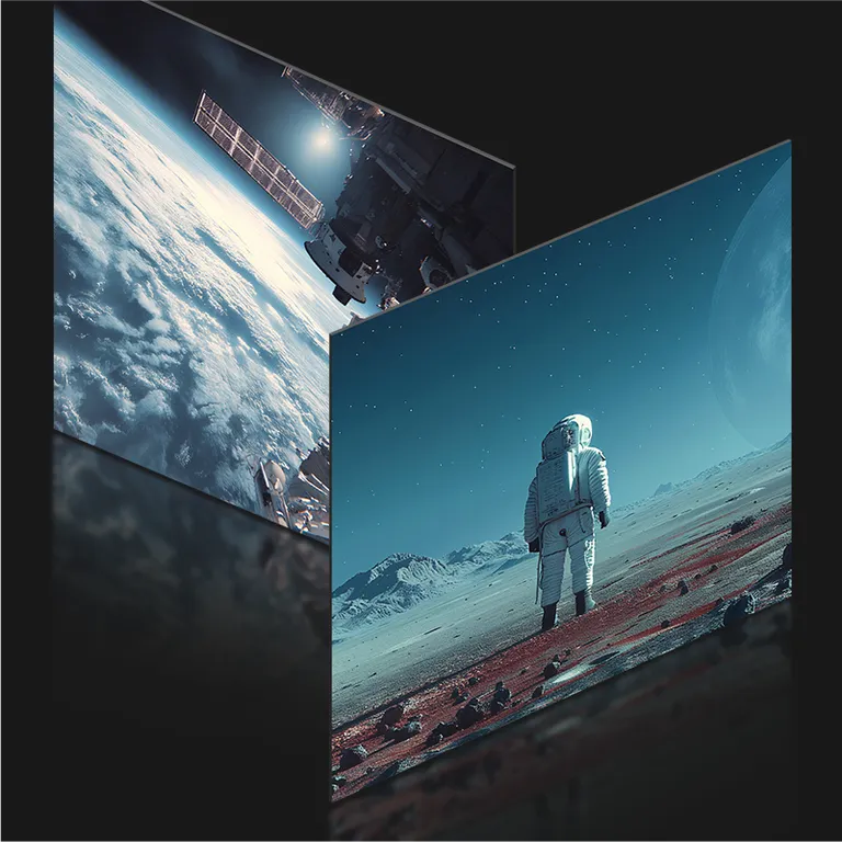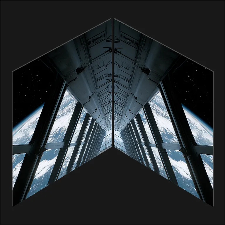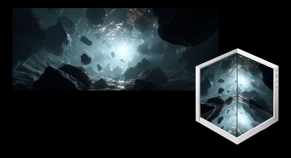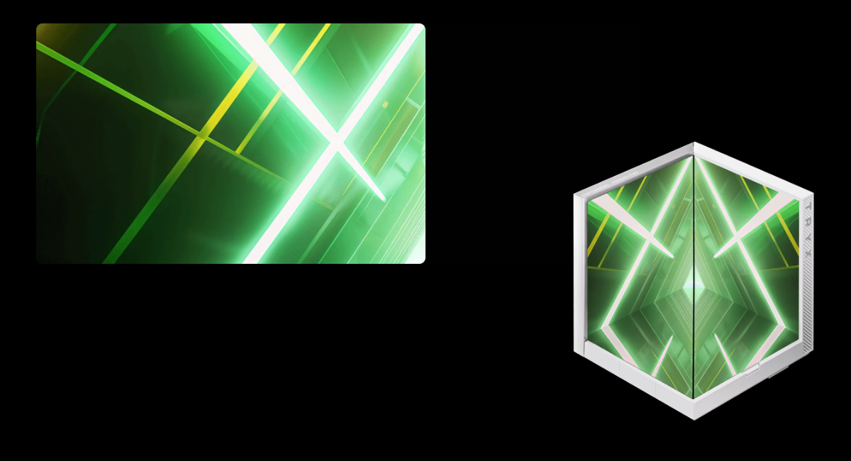 The STAGE display's second screen mirrors the primary screen in it's "Mirror Mode", combining with a reflective base to create a captivating kaleidscopic effect, showcasing vibrant, abstract visuals