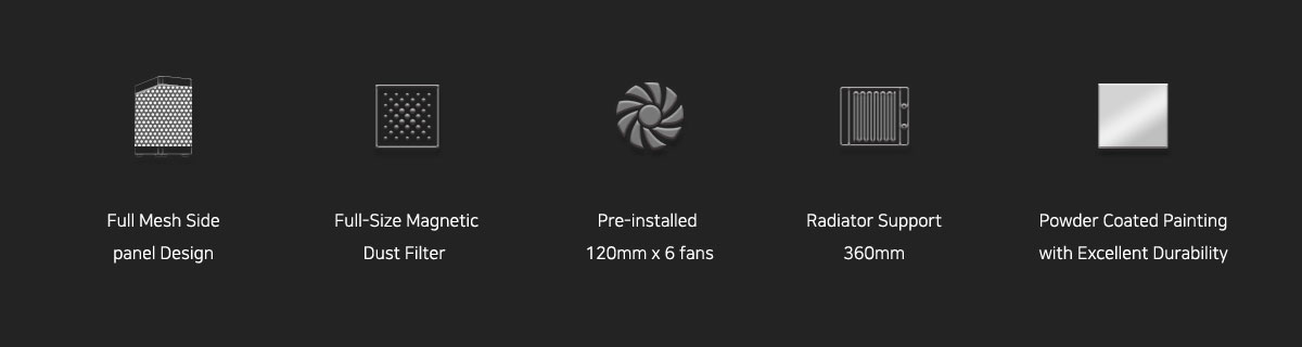 Pre-installed 120mm x 6 fans (Front x 3 , Top x 2 , Rear x 1) and optimized ventilation provide quick heat dissipation from the case